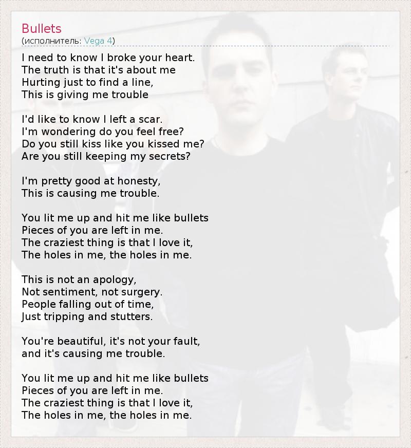 Мне нужно знать, что я сломал свое сердце . Правда в том, что это про меня Больно только, чтобы найти линию , Это дает мне неприятности Я хотел бы знать, что я остался шрам . Мне интересно, вы не стесняйтесь ? Вы все еще целоваться ты поцеловал меня ? Вы все еще сохраняя свои секреты ? Я довольно хорошо честности , Это вызывает у меня беспокойство. Вы освещено меня и ударил меня , как пули Кусочки вас осталось во мне. Сумасшедшая вещь , что я люблю его, Отверстия в меня , отверстия в меня. Это неизвинение, Не чувство, не хирургия . Люди падают вне времени, Просто отключения и заикается . Ты прекрасна, это не ваша вина, и это вызывает у меня беспокойство. Вы освещено меня и ударил меня , как пули Кусочки вас осталось во мне. Сумасшедшая вещь , что я люблю его, Отверстия в меня , отверстия в меня.