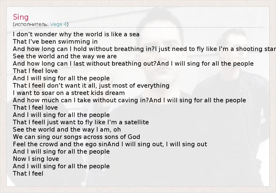 I don't wonder why the world is like a sea That I've been swimming in And how long can I hold without breathing in?I just need to fly like I'm a shooting star See the world and the way we are And how long can I last without breathing out?And I will sing for all the people That I feel love And I will sing for all the people That I feelI don't want it all, just most of everything I want to soar on a street kids dream And how much can I take without caving in?And I will sing for all the people That I feel love And I will sing for all the people That I feelI just want to fly like I'm a satellite See the world and the way I am, oh We can sing our songs across sons of God Feel the crowd and the ego sinAnd I will sing out, I will sing out And I will sing for all the people Now I sing love And I will sing for all the people That I feel
