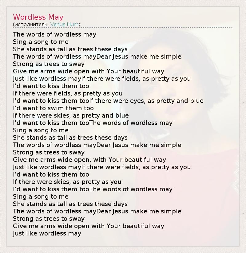 The words of wordless may Sing a song to me She stands as tall as trees these days The words of wordless mayDear Jesus make me simple Strong as trees to sway Give me arms wide open with Your beautiful way Just like wordless mayIf there were fields, as pretty as you I'd want to kiss them too If there were fields, as pretty as you I'd want to kiss them tooIf there were eyes, as pretty and blue I'd want to swim them too If there were skies, as pretty and blue I'd want to kiss them tooThe words of wordless may Sing a song to me She stands as tall as trees these days The words of wordless mayDear Jesus make me simple Strong as trees to sway Give me arms wide open, with Your beautiful way Just like wordless mayIf there were fields, as pretty as you I'd want to kiss them too If there were skies, as pretty as you I'd want to kiss them tooThe words of wordless may Sing a song to me She stands as tall as trees these days The words of wordless mayDear Jesus make me simple Strong as trees to sway Give me arms wide open with Your beautiful way Just like wordless may