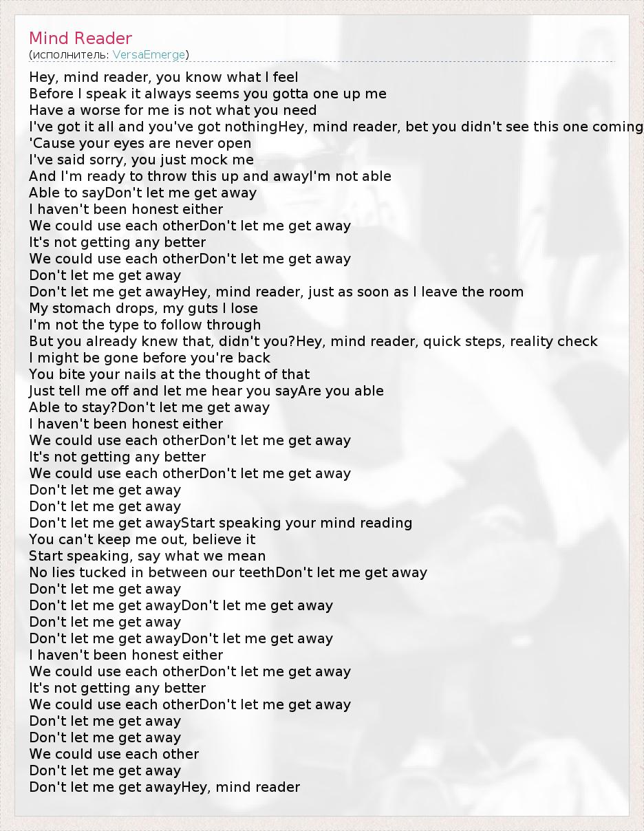 Hey, mind reader, you know what I feel Before I speak it always seems you gotta one up me Have a worse for me is not what you need I've got it all and you've got nothingHey, mind reader, bet you didn't see this one coming 'Cause your eyes are never open I've said sorry, you just mock me And I'm ready to throw this up and awayI'm not able Able to sayDon't let me get away I haven't been honest either We could use each otherDon't let me get away It's not getting any better We could use each otherDon't let me get away Don't let me get away Don't let me get awayHey, mind reader, just as soon as I leave the room My stomach drops, my guts I lose I'm not the type to follow through But you already knew that, didn't you?Hey, mind reader, quick steps, reality check I might be gone before you're back You bite your nails at the thought of that Just tell me off and let me hear you sayAre you able Able to stay?Don't let me get away I haven't been honest either We could use each otherDon't let me get away It's not getting any better We could use each otherDon't let me get away Don't let me get away Don't let me get away Don't let me get awayStart speaking your mind reading You can't keep me out, believe it Start speaking, say what we mean No lies tucked in between our teethDon't let me get away Don't let me get away Don't let me get awayDon't let me get away Don't let me get away Don't let me get awayDon't let me get away I haven't been honest either We could use each otherDon't let me get away It's not getting any better We could use each otherDon't let me get away Don't let me get away Don't let me get away We could use each other Don't let me get away Don't let me get awayHey, mind reader