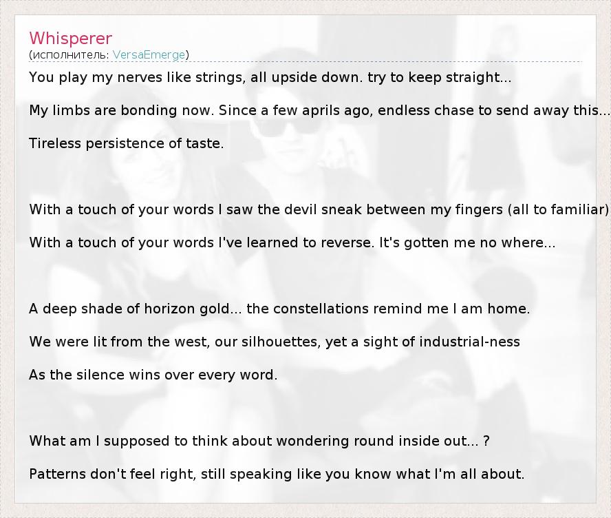 You play my nerves like strings, all upside down. try to keep straight... My limbs are bonding now. Since a few aprils ago, endless chase to send away this... Tireless persistence of taste. With a touch of your words I saw the devil sneak between my fingers (all to familiar) With a touch of your words I've learned to reverse. It's gotten me no where... A deep shade of horizon gold... the constellations remind me I am home. We were lit from the west, our silhouettes, yet a sight of industrial-ness As the silence wins over every word. What am I supposed to think about wondering round inside out... ? Patterns don't feel right, still speaking like you know what I'm all about.