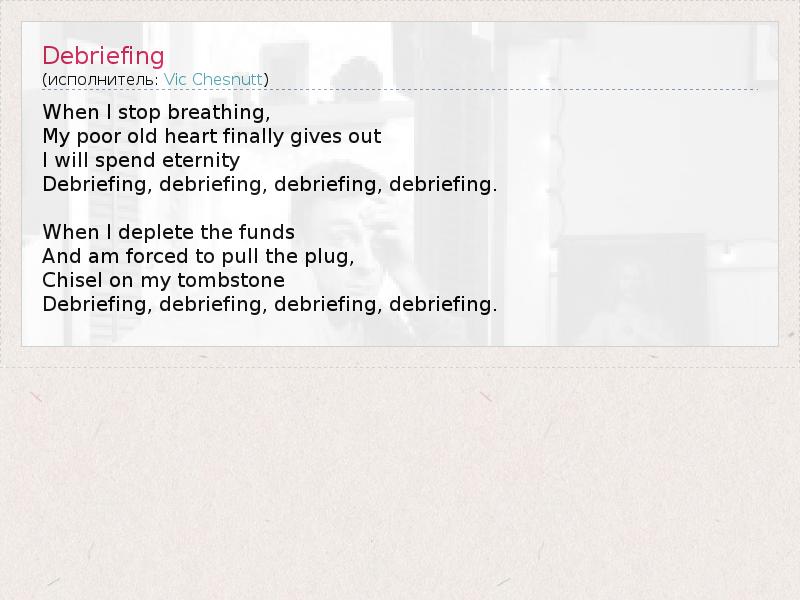 When I stop breathing, My poor old heart finally gives out I will spend eternity Debriefing, debriefing, debriefing, debriefing. When I deplete the funds And am forced to pull the plug, Chisel on my tombstone Debriefing, debriefing, debriefing, debriefing.