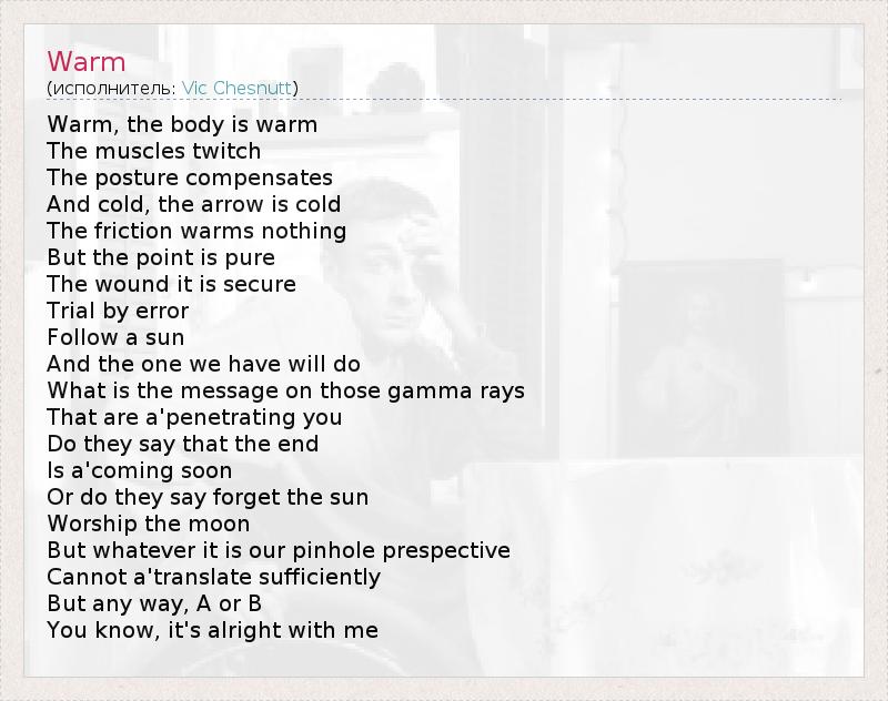 Warm, the body is warm The muscles twitch The posture compensates And cold, the arrow is cold The friction warms nothing But the point is pure The wound it is secure Trial by error Follow a sun And the one we have will do What is the message on those gamma rays That are a'penetrating you Do they say that the end Is a'coming soon Or do they say forget the sun Worship the moon But whatever it is our pinhole prespective Cannot a'translate sufficiently But any way, A or B You know, it's alright with me