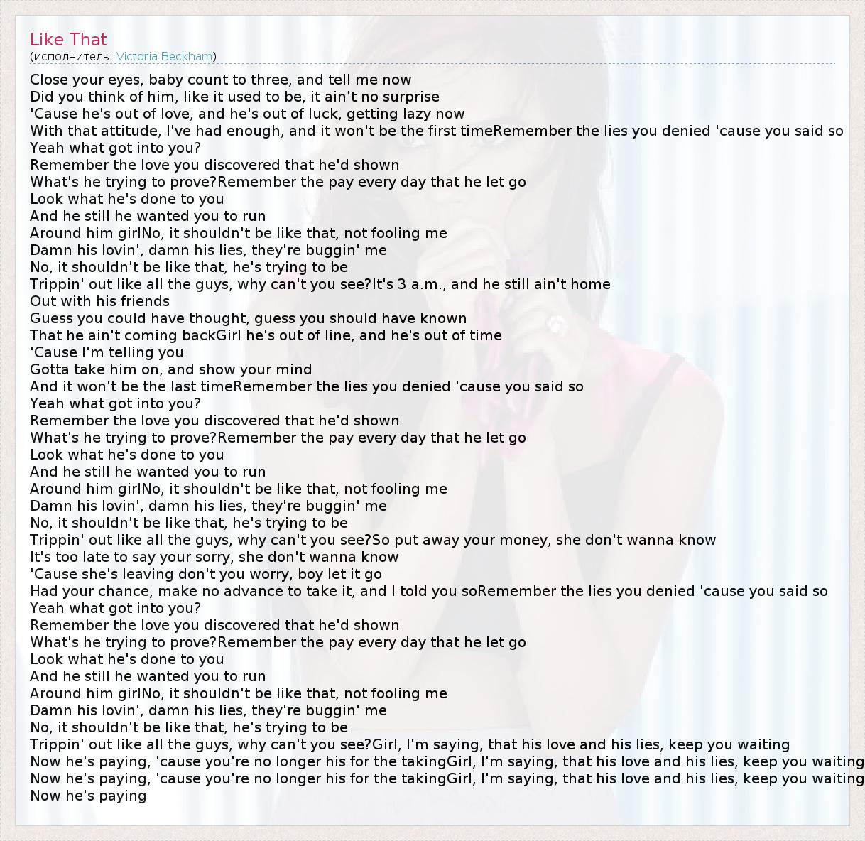 Close your eyes, baby count to three, and tell me now Did you think of him, like it used to be, it ain't no surprise 'Cause he's out of love, and he's out of luck, getting lazy now With that attitude, I've had enough, and it won't be the first timeRemember the lies you denied 'cause you said so Yeah what got into you? Remember the love you discovered that he'd shown What's he trying to prove?Remember the pay every day that he let go Look what he's done to you And he still he wanted you to run Around him girlNo, it shouldn't be like that, not fooling me Damn his lovin', damn his lies, they're buggin' me No, it shouldn't be like that, he's trying to be Trippin' out like all the guys, why can't you see?It's 3 a.m., and he still ain't home Out with his friends Guess you could have thought, guess you should have known That he ain't coming backGirl he's out of line, and he's out of time 'Cause I'm telling you Gotta take him on, and show your mind And it won't be the last timeRemember the lies you denied 'cause you said so Yeah what got into you? Remember the love you discovered that he'd shown What's he trying to prove?Remember the pay every day that he let go Look what he's done to you And he still he wanted you to run Around him girlNo, it shouldn't be like that, not fooling me Damn his lovin', damn his lies, they're buggin' me No, it shouldn't be like that, he's trying to be Trippin' out like all the guys, why can't you see?So put away your money, she don't wanna know It's too late to say your sorry, she don't wanna know 'Cause she's leaving don't you worry, boy let it go Had your chance, make no advance to take it, and I told you soRemember the lies you denied 'cause you said so Yeah what got into you? Remember the love you discovered that he'd shown What's he trying to prove?Remember the pay every day that he let go Look what he's done to you And he still he wanted you to run Around him girlNo, it shouldn't be like that, not fooling me Damn his lovin', damn his lies, they're buggin' me No, it shouldn't be like that, he's trying to be Trippin' out like all the guys, why can't you see?Girl, I'm saying, that his love and his lies, keep you waiting Now he's paying, 'cause you're no longer his for the takingGirl, I'm saying, that his love and his lies, keep you waiting Now he's paying, 'cause you're no longer his for the takingGirl, I'm saying, that his love and his lies, keep you waiting Now he's paying