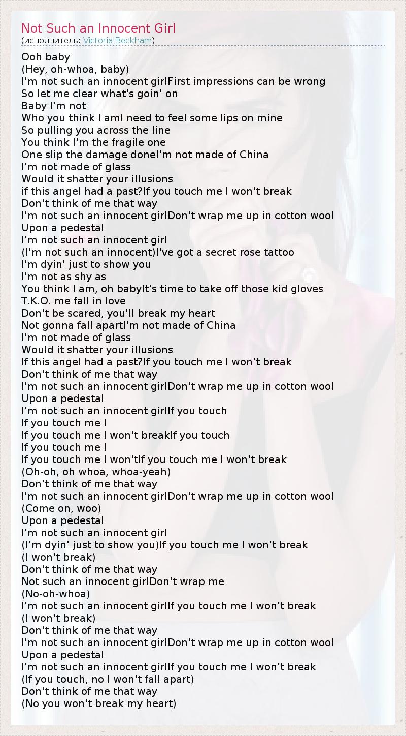 Ooh baby (Hey, oh-whoa, baby) I'm not such an innocent girlFirst impressions can be wrong So let me clear what's goin' on Baby I'm not Who you think I amI need to feel some lips on mine So pulling you across the line You think I'm the fragile one One slip the damage doneI'm not made of China I'm not made of glass Would it shatter your illusions if this angel had a past?If you touch me I won't break Don't think of me that way I'm not such an innocent girlDon't wrap me up in cotton wool Upon a pedestal I'm not such an innocent girl (I'm not such an innocent)I've got a secret rose tattoo I'm dyin' just to show you I'm not as shy as You think I am, oh babyIt's time to take off those kid gloves T.K.O. me fall in love Don't be scared, you'll break my heart Not gonna fall apartI'm not made of China I'm not made of glass Would it shatter your illusions If this angel had a past?If you touch me I won't break Don't think of me that way I'm not such an innocent girlDon't wrap me up in cotton wool Upon a pedestal I'm not such an innocent girlIf you touch If you touch me I If you touch me I won't breakIf you touch If you touch me I If you touch me I won'tIf you touch me I won't break (Oh-oh, oh whoa, whoa-yeah) Don't think of me that way I'm not such an innocent girlDon't wrap me up in cotton wool (Come on, woo) Upon a pedestal I'm not such an innocent girl (I'm dyin' just to show you)If you touch me I won't break (I won't break) Don't think of me that way Not such an innocent girlDon't wrap me (No-oh-whoa) I'm not such an innocent girlIf you touch me I won't break (I won't break) Don't think of me that way I'm not such an innocent girlDon't wrap me up in cotton wool Upon a pedestal I'm not such an innocent girlIf you touch me I won't break (If you touch, no I won't fall apart) Don't think of me that way (No you won't break my heart)