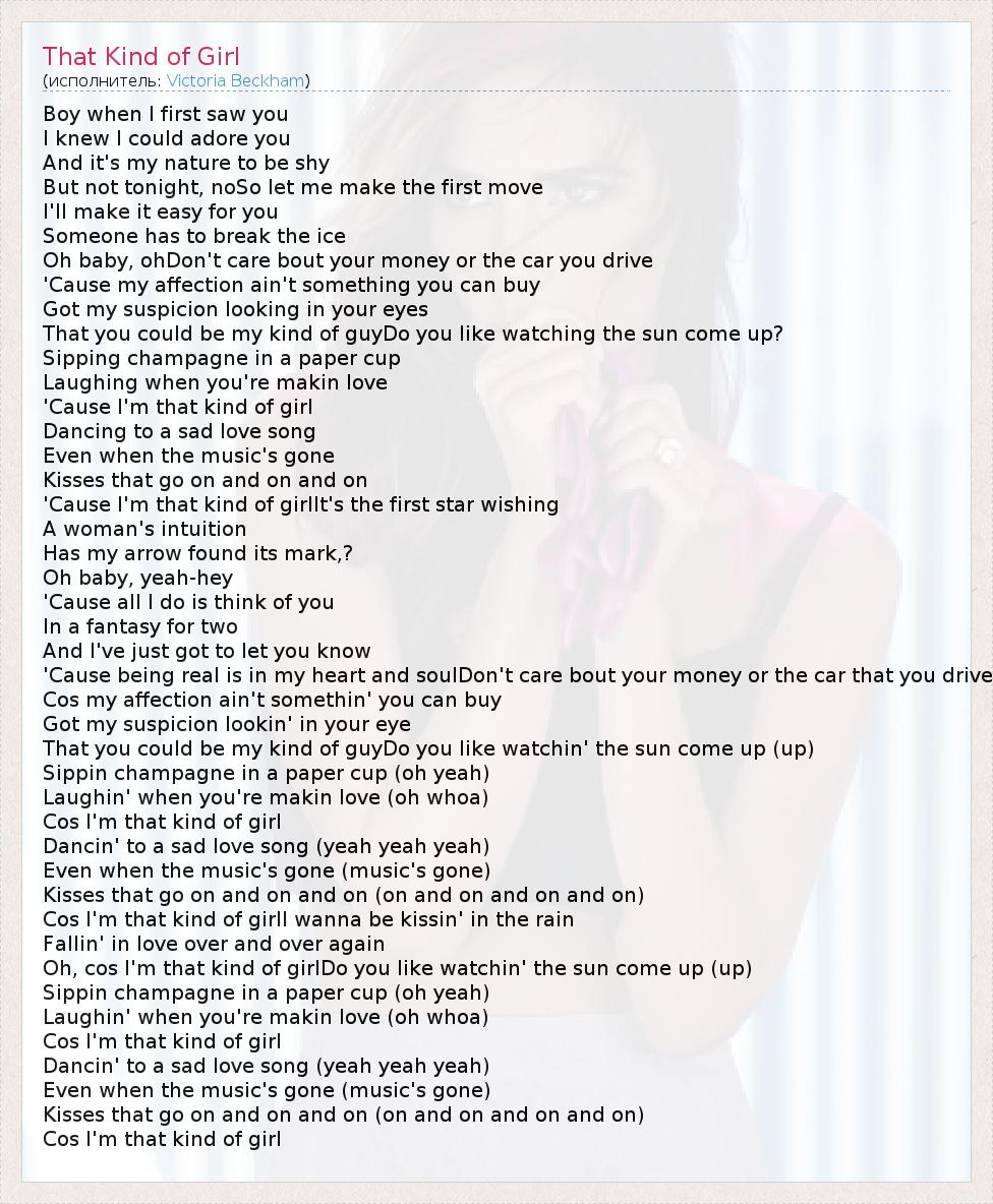 Boy when I first saw you I knew I could adore you And it's my nature to be shy But not tonight, noSo let me make the first move I'll make it easy for you Someone has to break the ice Oh baby, ohDon't care bout your money or the car you drive 'Cause my affection ain't something you can buy Got my suspicion looking in your eyes That you could be my kind of guyDo you like watching the sun come up? Sipping champagne in a paper cup Laughing when you're makin love 'Cause I'm that kind of girl Dancing to a sad love song Even when the music's gone Kisses that go on and on and on 'Cause I'm that kind of girlIt's the first star wishing A woman's intuition Has my arrow found its mark,? Oh baby, yeah-hey 'Cause all I do is think of you In a fantasy for two And I've just got to let you know 'Cause being real is in my heart and soulDon't care bout your money or the car that you drive Cos my affection ain't somethin' you can buy Got my suspicion lookin' in your eye That you could be my kind of guyDo you like watchin' the sun come up (up) Sippin champagne in a paper cup (oh yeah) Laughin' when you're makin love (oh whoa) Cos I'm that kind of girl Dancin' to a sad love song (yeah yeah yeah) Even when the music's gone (music's gone) Kisses that go on and on and on (on and on and on and on) Cos I'm that kind of girlI wanna be kissin' in the rain Fallin' in love over and over again Oh, cos I'm that kind of girlDo you like watchin' the sun come up (up) Sippin champagne in a paper cup (oh yeah) Laughin' when you're makin love (oh whoa) Cos I'm that kind of girl Dancin' to a sad love song (yeah yeah yeah) Even when the music's gone (music's gone) Kisses that go on and on and on (on and on and on and on) Cos I'm that kind of girl