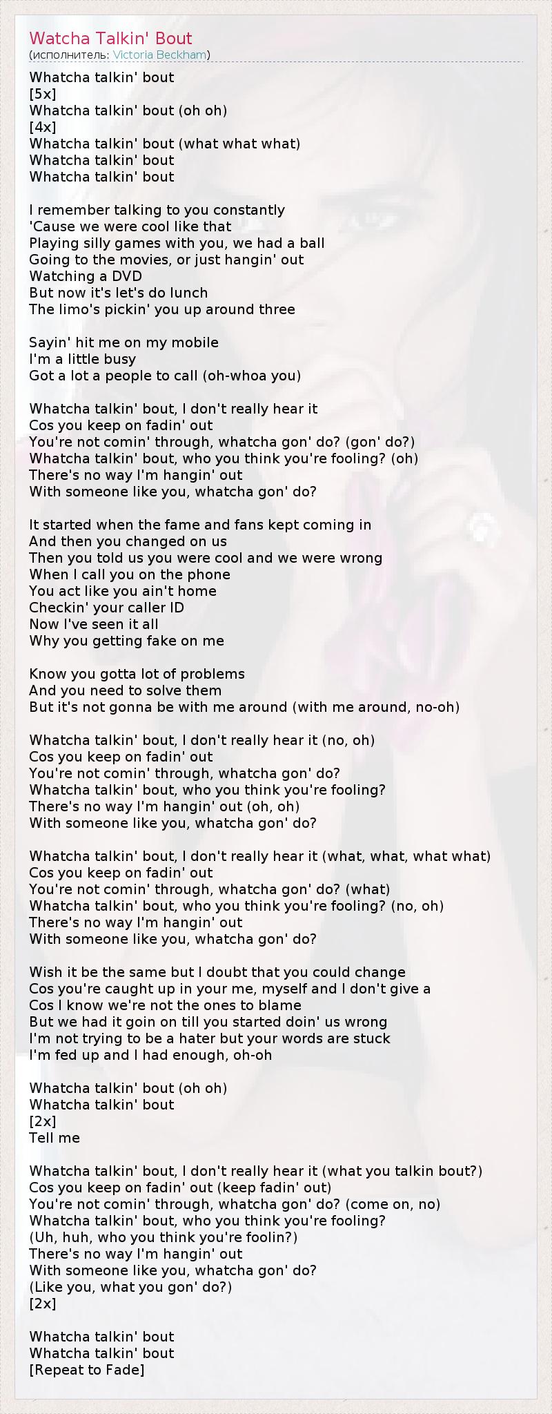 Whatcha talkin' bout [5x] Whatcha talkin' bout (oh oh) [4x] Whatcha talkin' bout (what what what) Whatcha talkin' bout Whatcha talkin' bout I remember talking to you constantly 'Cause we were cool like that Playing silly games with you, we had a ball Going to the movies, or just hangin' out Watching a DVD But now it's let's do lunch The limo's pickin' you up around three Sayin' hit me on my mobile I'm a little busy Got a lot a people to call (oh-whoa you) Whatcha talkin' bout, I don't really hear it Cos you keep on fadin' out You're not comin' through, whatcha gon' do? (gon' do?) Whatcha talkin' bout, who you think you're fooling? (oh) There's no way I'm hangin' out With someone like you, whatcha gon' do? It started when the fame and fans kept coming in And then you changed on us Then you told us you were cool and we were wrong When I call you on the phone You act like you ain't home Checkin' your caller ID Now I've seen it all Why you getting fake on me Know you gotta lot of problems And you need to solve them But it's not gonna be with me around (with me around, no-oh) Whatcha talkin' bout, I don't really hear it (no, oh) Cos you keep on fadin' out You're not comin' through, whatcha gon' do? Whatcha talkin' bout, who you think you're fooling? There's no way I'm hangin' out (oh, oh) With someone like you, whatcha gon' do? Whatcha talkin' bout, I don't really hear it (what, what, what what) Cos you keep on fadin' out You're not comin' through, whatcha gon' do? (what) Whatcha talkin' bout, who you think you're fooling? (no, oh) There's no way I'm hangin' out With someone like you, whatcha gon' do? Wish it be the same but I doubt that you could change Cos you're caught up in your me, myself and I don't give a Cos I know we're not the ones to blame But we had it goin on till you started doin' us wrong I'm not trying to be a hater but your words are stuck I'm fed up and I had enough, oh-oh Whatcha talkin' bout (oh oh) Whatcha talkin' bout [2x] Tell me Whatcha talkin' bout, I don't really hear it (what you talkin bout?) Cos you keep on fadin' out (keep fadin' out) You're not comin' through, whatcha gon' do? (come on, no) Whatcha talkin' bout, who you think you're fooling? (Uh, huh, who you think you're foolin?) There's no way I'm hangin' out With someone like you, whatcha gon' do? (Like you, what you gon' do?) [2x] Whatcha talkin' bout Whatcha talkin' bout [Repeat to Fade]