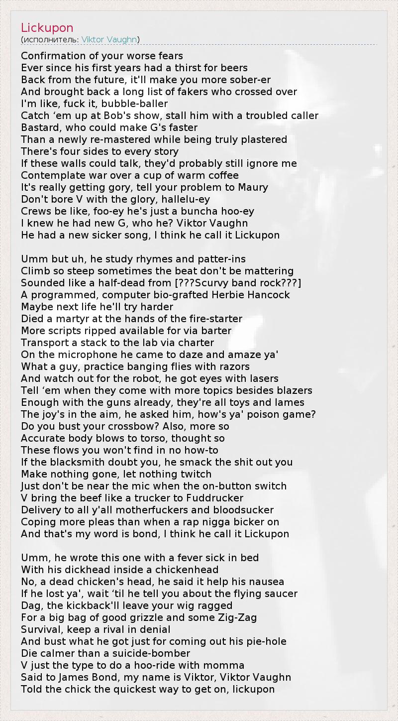 Confirmation of your worse fears Ever since his first years had a thirst for beers Back from the future, it'll make you more sober-er And brought back a long list of fakers who crossed over I'm like, fuck it, bubble-baller Catch ‘em up at Bob's show, stall him with a troubled caller Bastard, who could make G's faster Than a newly re-mastered while being truly plastered There's four sides to every story If these walls could talk, they'd probably still ignore me Contemplate war over a cup of warm coffee It's really getting gory, tell your problem to Maury Don't bore V with the glory, hallelu-ey Crews be like, foo-ey he's just a buncha hoo-ey I knew he had new G, who he? Viktor Vaughn He had a new sicker song, I think he call it Lickupon Umm but uh, he study rhymes and patter-ins Climb so steep sometimes the beat don't be mattering Sounded like a half-dead from [???Scurvy band rock???] A programmed, computer bio-grafted Herbie Hancock Maybe next life he'll try harder Died a martyr at the hands of the fire-starter More scripts ripped available for via barter Transport a stack to the lab via charter On the microphone he came to daze and amaze ya' What a guy, practice banging flies with razors And watch out for the robot, he got eyes with lasers Tell ‘em when they come with more topics besides blazers Enough with the guns already, they're all toys and lames The joy's in the aim, he asked him, how's ya' poison game? Do you bust your crossbow? Also, more so Accurate body blows to torso, thought so These flows you won't find in no how-to If the blacksmith doubt you, he smack the shit out you Make nothing gone, let nothing twitch Just don't be near the mic when the on-button switch V bring the beef like a trucker to Fuddrucker Delivery to all y'all motherfuckers and bloodsucker Coping more pleas than when a rap nigga bicker on And that's my word is bond, I think he call it Lickupon Umm, he wrote this one with a fever sick in bed With his dickhead inside a chickenhead No, a dead chicken's head, he said it help his nausea If he lost ya', wait ‘til he tell you about the flying saucer Dag, the kickback'll leave your wig ragged For a big bag of good grizzle and some Zig-Zag Survival, keep a rival in denial And bust what he got just for coming out his pie-hole Die calmer than a suicide-bomber V just the type to do a hoo-ride with momma Said to James Bond, my name is Viktor, Viktor Vaughn Told the chick the quickest way to get on, lickupon