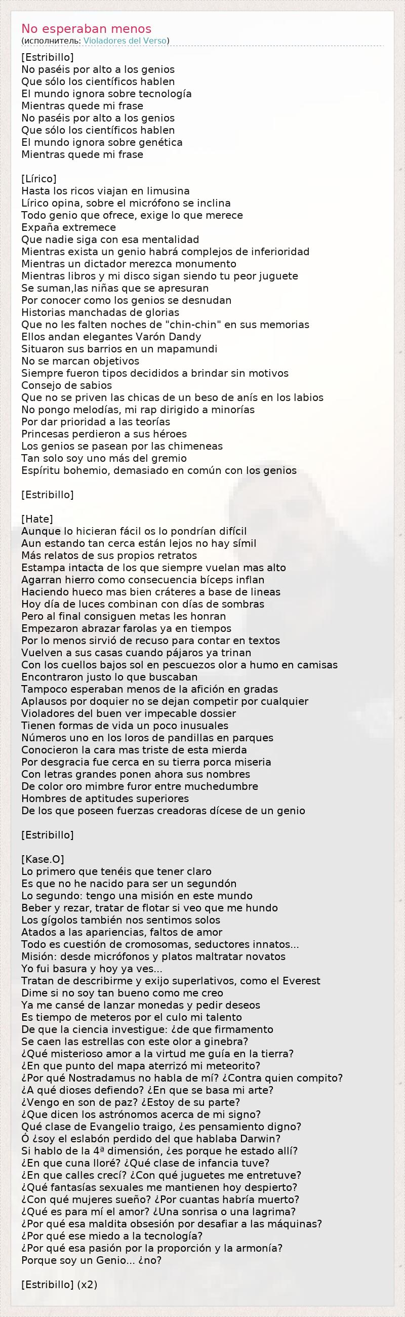 [Estribillo] No paséis por alto a los genios Que sólo los científicos hablen El mundo ignora sobre tecnología Mientras quede mi frase No paséis por alto a los genios Que sólo los científicos hablen El mundo ignora sobre genética Mientras quede mi frase [Lírico] Hasta los ricos viajan en limusina Lírico opina, sobre el micrófono se inclina Todo genio que ofrece, exige lo que merece Expaña extremece Que nadie siga con esa mentalidad Mientras exista un genio habrá complejos de inferioridad Mientras un dictador merezca monumento Mientras libros y mi disco sigan siendo tu peor juguete Se suman,las niñas que se apresuran Por conocer como los genios se desnudan Historias manchadas de glorias Que no les falten noches de "chin-chin" en sus memorias Ellos andan elegantes Varón Dandy Situaron sus barrios en un mapamundi No se marcan objetivos Siempre fueron tipos decididos a brindar sin motivos Consejo de sabios Que no se priven las chicas de un beso de anís en los labios No pongo melodías, mi rap dirigido a minorías Por dar prioridad a las teorías Princesas perdieron a sus héroes Los genios se pasean por las chimeneas Tan solo soy uno más del gremio Espíritu bohemio, demasiado en común con los genios [Estribillo] [Hate] Aunque lo hicieran fácil os lo pondrían difícil Aun estando tan cerca están lejos no hay símil Más relatos de sus propios retratos Estampa intacta de los que siempre vuelan mas alto Agarran hierro como consecuencia bíceps inflan Haciendo hueco mas bien cráteres a base de lineas Hoy día de luces combinan con días de sombras Pero al final consiguen metas les honran Empezaron abrazar farolas ya en tiempos Por lo menos sirvió de recuso para contar en textos Vuelven a sus casas cuando pájaros ya trinan Con los cuellos bajos sol en pescuezos olor a humo en camisas Encontraron justo lo que buscaban Tampoco esperaban menos de la afición en gradas Aplausos por doquier no se dejan competir por cualquier Violadores del buen ver impecable dossier Tienen formas de vida un poco inusuales Números uno en los loros de pandillas en parques Conocieron la cara mas triste de esta mierda Por desgracia fue cerca en su tierra porca miseria Con letras grandes ponen ahora sus nombres De color oro mimbre furor entre muchedumbre Hombres de aptitudes superiores De los que poseen fuerzas creadoras dícese de un genio [Estribillo] [Kase.O] Lo primero que tenéis que tener claro Es que no he nacido para ser un segundón Lo segundo: tengo una misión en este mundo Beber y rezar, tratar de flotar si veo que me hundo Los gígolos también nos sentimos solos Atados a las apariencias, faltos de amor Todo es cuestión de cromosomas, seductores innatos... Misión: desde micrófonos y platos maltratar novatos Yo fui basura y hoy ya ves... Tratan de describirme y exijo superlativos, como el Everest Dime si no soy tan bueno como me creo Ya me cansé de lanzar monedas y pedir deseos Es tiempo de meteros por el culo mi talento De que la ciencia investigue: ¿de que firmamento Se caen las estrellas con este olor a ginebra? ¿Qué misterioso amor a la virtud me guía en la tierra? ¿En que punto del mapa aterrizó mi meteorito? ¿Por qué Nostradamus no habla de mí? ¿Contra quien compito? ¿A qué dioses defiendo? ¿En que se basa mi arte? ¿Vengo en son de paz? ¿Estoy de su parte? ¿Que dicen los astrónomos acerca de mi signo? Qué clase de Evangelio traigo, ¿es pensamiento digno? Ó ¿soy el eslabón perdido del que hablaba Darwin? Si hablo de la 4ª dimensión, ¿es porque he estado allí? ¿En que cuna lloré? ¿Qué clase de infancia tuve? ¿En que calles crecí? ¿Con qué juguetes me entretuve? ¿Qué fantasías sexuales me mantienen hoy despierto? ¿Con qué mujeres sueño? ¿Por cuantas habría muerto? ¿Qué es para mí el amor? ¿Una sonrisa o una lagrima? ¿Por qué esa maldita obsesión por desafiar a las máquinas? ¿Por qué ese miedo a la tecnología? ¿Por qué esa pasión por la proporción y la armonía? Porque soy un Genio... ¿no? [Estribillo] (x2)