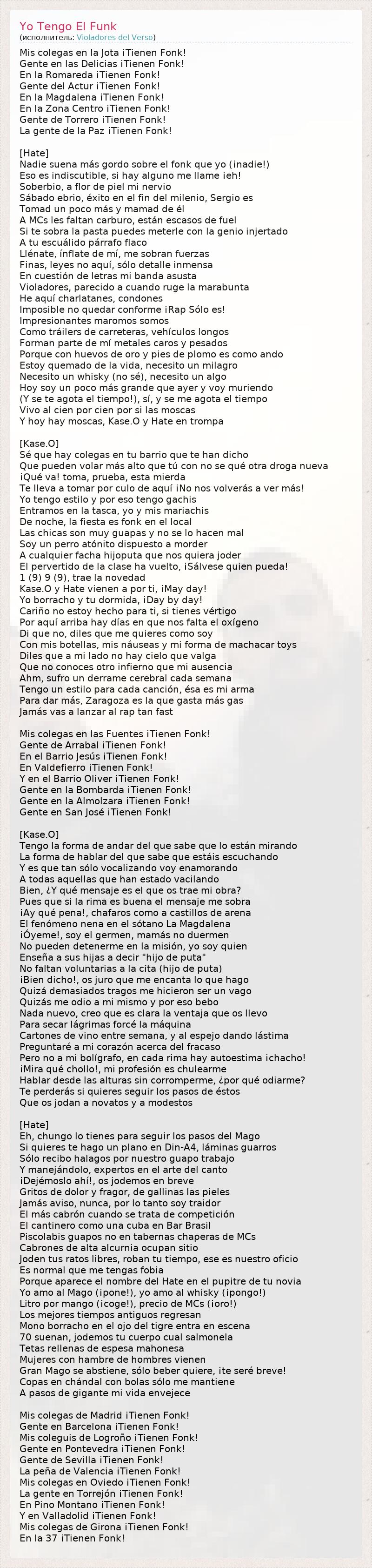 Mis colegas en la Jota ¡Tienen Fonk! Gente en las Delicias ¡Tienen Fonk! En la Romareda ¡Tienen Fonk! Gente del Actur ¡Tienen Fonk! En la Magdalena ¡Tienen Fonk! En la Zona Centro ¡Tienen Fonk! Gente de Torrero ¡Tienen Fonk! La gente de la Paz ¡Tienen Fonk! [Hate] Nadie suena más gordo sobre el fonk que yo (¡nadie!) Eso es indiscutible, si hay alguno me llame ¡eh! Soberbio, a flor de piel mi nervio Sábado ebrio, éxito en el fin del milenio, Sergio es Tomad un poco más y mamad de él A MCs les faltan carburo, están escasos de fuel Si te sobra la pasta puedes meterle con la genio injertado A tu escuálido párrafo flaco Llénate, ínflate de mí, me sobran fuerzas Finas, leyes no aquí, sólo detalle inmensa En cuestión de letras mi banda asusta Violadores, parecido a cuando ruge la marabunta He aquí charlatanes, condones Imposible no quedar conforme ¡Rap Sólo es! Impresionantes maromos somos Como tráilers de carreteras, vehículos longos Forman parte de mí metales caros y pesados Porque con huevos de oro y pies de plomo es como ando Estoy quemado de la vida, necesito un milagro Necesito un whisky (no sé), necesito un algo Hoy soy un poco más grande que ayer y voy muriendo (Y se te agota el tiempo!), sí, y se me agota el tiempo Vivo al cien por cien por si las moscas Y hoy hay moscas, Kase.O y Hate en trompa [Kase.O] Sé que hay colegas en tu barrio que te han dicho Que pueden volar más alto que tú con no se qué otra droga nueva ¡Qué va! toma, prueba, esta mierda Te lleva a tomar por culo de aquí ¡No nos volverás a ver más! Yo tengo estilo y por eso tengo gachis Entramos en la tasca, yo y mis mariachis De noche, la fiesta es fonk en el local Las chicas son muy guapas y no se lo hacen mal Soy un perro atónito dispuesto a morder A cualquier facha hijoputa que nos quiera joder El pervertido de la clase ha vuelto, ¡Sálvese quien pueda! 1 (9) 9 (9), trae la novedad Kase.O y Hate vienen a por ti, ¡May day! Yo borracho y tu dormida, ¡Day by day! Cariño no estoy hecho para ti, si tienes vértigo Por aquí arriba hay días en que nos falta el oxígeno Di que no, diles que me quieres como soy Con mis botellas, mis náuseas y mi forma de machacar toys Diles que a mi lado no hay cielo que valga Que no conoces otro infierno que mi ausencia Ahm, sufro un derrame cerebral cada semana Tengo un estilo para cada canción, ésa es mi arma Para dar más, Zaragoza es la que gasta más gas Jamás vas a lanzar al rap tan fast Mis colegas en las Fuentes ¡Tienen Fonk! Gente de Arrabal ¡Tienen Fonk! En el Barrio Jesús ¡Tienen Fonk! En Valdefierro ¡Tienen Fonk! Y en el Barrio Oliver ¡Tienen Fonk! Gente en la Bombarda ¡Tienen Fonk! Gente en la Almolzara ¡Tienen Fonk! Gente en San José ¡Tienen Fonk! [Kase.O] Tengo la forma de andar del que sabe que lo están mirando La forma de hablar del que sabe que estáis escuchando Y es que tan sólo vocalizando voy enamorando A todas aquellas que han estado vacilando Bien, ¿Y qué mensaje es el que os trae mi obra? Pues que si la rima es buena el mensaje me sobra ¡Ay qué pena!, chafaros como a castillos de arena El fenómeno nena en el sótano La Magdalena ¡Óyeme!, soy el germen, mamás no duermen No pueden detenerme en la misión, yo soy quien Enseña a sus hijas a decir "hijo de puta" No faltan voluntarias a la cita (hijo de puta) ¡Bien dicho!, os juro que me encanta lo que hago Quizá demasiados tragos me hicieron ser un vago Quizás me odio a mi mismo y por eso bebo Nada nuevo, creo que es clara la ventaja que os llevo Para secar lágrimas forcé la máquina Cartones de vino entre semana, y al espejo dando lástima Preguntaré a mi corazón acerca del fracaso Pero no a mi bolígrafo, en cada rima hay autoestima ¡chacho! ¡Mira qué chollo!, mi profesión es chulearme Hablar desde las alturas sin corromperme, ¿por qué odiarme? Te perderás si quieres seguir los pasos de éstos Que os jodan a novatos y a modestos [Hate] Eh, chungo lo tienes para seguir los pasos del Mago Si quieres te hago un plano en Din-A4, láminas guarros Sólo recibo halagos por nuestro guapo trabajo Y manejándolo, expertos en el arte del canto ¡Dejémoslo ahí!, os jodemos en breve Gritos de dolor y fragor, de gallinas las pieles Jamás aviso, nunca, por lo tanto soy traidor El más cabrón cuando se trata de competición El cantinero como una cuba en Bar Brasil Piscolabis guapos no en tabernas chaperas de MCs Cabrones de alta alcurnia ocupan sitio Joden tus ratos libres, roban tu tiempo, ese es nuestro oficio Es normal que me tengas fobia Porque aparece el nombre del Hate en el pupitre de tu novia Yo amo al Mago (¡pone!), yo amo al whisky (¡pongo!) Litro por mango (¡coge!), precio de MCs (¡oro!) Los mejores tiempos antiguos regresan Mono borracho en el ojo del tigre entra en escena 70 suenan, jodemos tu cuerpo cual salmonela Tetas rellenas de espesa mahonesa Mujeres con hambre de hombres vienen Gran Mago se abstiene, sólo beber quiere, ¡te seré breve! Copas en chándal con bolas sólo me mantiene A pasos de gigante mi vida envejece Mis colegas de Madrid ¡Tienen Fonk! Gente en Barcelona ¡Tienen Fonk! Mis coleguis de Logroño ¡Tienen Fonk! Gente en Pontevedra ¡Tienen Fonk! Gente de Sevilla ¡Tienen Fonk! La peña de Valencia ¡Tienen Fonk! Mis colegas en Oviedo ¡Tienen Fonk! La gente en Torrejón ¡Tienen Fonk! En Pino Montano ¡Tienen Fonk! Y en Valladolid ¡Tienen Fonk! Mis colegas de Girona ¡Tienen Fonk! En la 37 ¡Tienen Fonk!