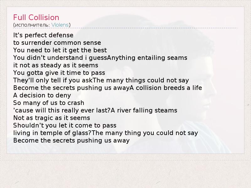 It's perfect defense to surrender common sense You need to let it get the best You didn't understand i guessAnything entailing seams it not as steady as it seems You gotta give it time to pass They'll only tell if you askThe many things could not say Become the secrets pushing us awayA collision breeds a life A decision to deny So many of us to crash 'cause will this really ever last?A river falling steams Not as tragic as it seems Shouldn't you let it come to pass living in temple of glass?The many thing you could not say Become the secrets pushing us away