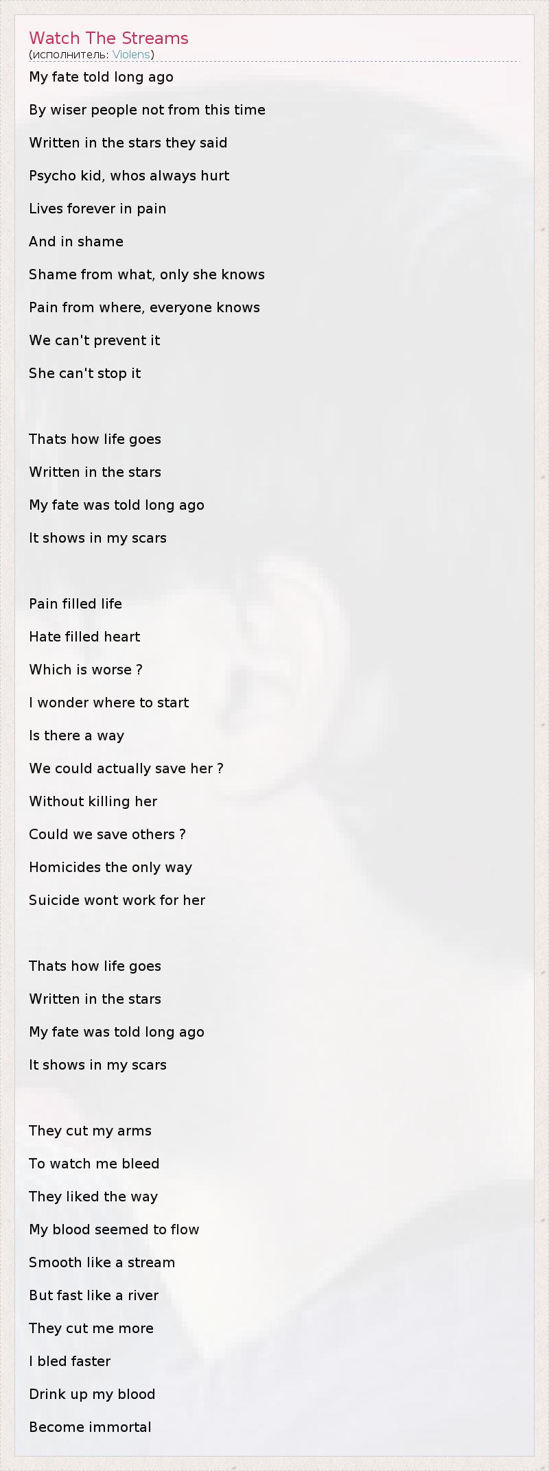 My fate told long ago By wiser people not from this time Written in the stars they said Psycho kid, whos always hurt Lives forever in pain And in shame Shame from what, only she knows Pain from where, everyone knows We can't prevent it She can't stop it Thats how life goes Written in the stars My fate was told long ago It shows in my scars Pain filled life Hate filled heart Which is worse ? I wonder where to start Is there a way We could actually save her ? Without killing her Could we save others ? Homicides the only way Suicide wont work for her Thats how life goes Written in the stars My fate was told long ago It shows in my scars They cut my arms To watch me bleed They liked the way My blood seemed to flow Smooth like a stream But fast like a river They cut me more I bled faster Drink up my blood Become immortal