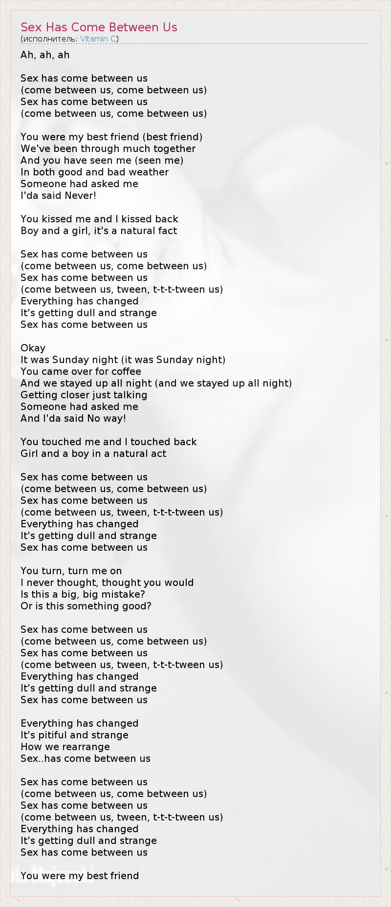Ah, ah, ah Sex has come between us (come between us, come between us) Sex has come between us (come between us, come between us) You were my best friend (best friend) We've been through much together And you have seen me (seen me) In both good and bad weather Someone had asked me I'da said Never! You kissed me and I kissed back Boy and a girl, it's a natural fact Sex has come between us (come between us, come between us) Sex has come between us (come between us, tween, t-t-t-tween us) Everything has changed It's getting dull and strange Sex has come between us Okay It was Sunday night (it was Sunday night) You came over for coffee And we stayed up all night (and we stayed up all night) Getting closer just talking Someone had asked me And I'da said No way! You touched me and I touched back Girl and a boy in a natural act Sex has come between us (come between us, come between us) Sex has come between us (come between us, tween, t-t-t-tween us) Everything has changed It's getting dull and strange Sex has come between us You turn, turn me on I never thought, thought you would Is this a big, big mistake? Or is this something good? Sex has come between us (come between us, come between us) Sex has come between us (come between us, tween, t-t-t-tween us) Everything has changed It's getting dull and strange Sex has come between us Everything has changed It's pitiful and strange How we rearrange Sex..has come between us Sex has come between us (come between us, come between us) Sex has come between us (come between us, tween, t-t-t-tween us) Everything has changed It's getting dull and strange Sex has come between us You were my best friend