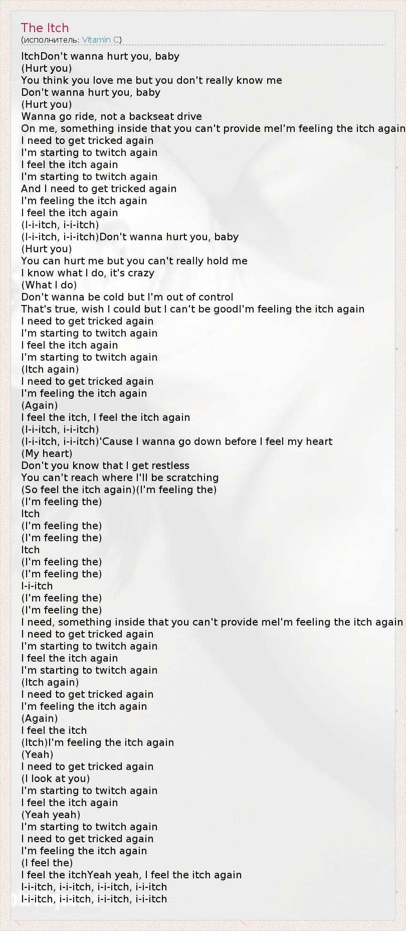 ItchDon't wanna hurt you, baby (Hurt you) You think you love me but you don't really know me Don't wanna hurt you, baby (Hurt you) Wanna go ride, not a backseat drive On me, something inside that you can't provide meI'm feeling the itch again I need to get tricked again I'm starting to twitch again I feel the itch again I'm starting to twitch again And I need to get tricked again I'm feeling the itch again I feel the itch again (I-i-itch, i-i-itch) (I-i-itch, i-i-itch)Don't wanna hurt you, baby (Hurt you) You can hurt me but you can't really hold me I know what I do, it's crazy (What I do) Don't wanna be cold but I'm out of control That's true, wish I could but I can't be goodI'm feeling the itch again I need to get tricked again I'm starting to twitch again I feel the itch again I'm starting to twitch again (Itch again) I need to get tricked again I'm feeling the itch again (Again) I feel the itch, I feel the itch again (I-i-itch, i-i-itch) (I-i-itch, i-i-itch)'Cause I wanna go down before I feel my heart (My heart) Don't you know that I get restless You can't reach where I'll be scratching (So feel the itch again)(I'm feeling the) (I'm feeling the) Itch (I'm feeling the) (I'm feeling the) Itch (I'm feeling the) (I'm feeling the) I-i-itch (I'm feeling the) (I'm feeling the) I need, something inside that you can't provide meI'm feeling the itch again I need to get tricked again I'm starting to twitch again I feel the itch again I'm starting to twitch again (Itch again) I need to get tricked again I'm feeling the itch again (Again) I feel the itch (Itch)I'm feeling the itch again (Yeah) I need to get tricked again (I look at you) I'm starting to twitch again I feel the itch again (Yeah yeah) I'm starting to twitch again I need to get tricked again I'm feeling the itch again (I feel the) I feel the itchYeah yeah, I feel the itch again I-i-itch, i-i-itch, i-i-itch, i-i-itch I-i-itch, i-i-itch, i-i-itch, i-i-itch