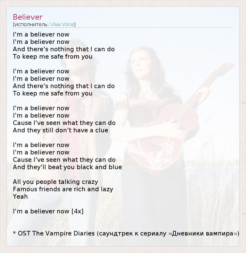 I'm a believer now I'm a believer now And there's nothing that I can do To keep me safe from you I'm a believer now I'm a believer now And there's nothing that I can do To keep me safe from you I'm a believer now I'm a believer now Cause I've seen what they can do And they still don't have a clue I'm a believer now I'm a believer now Cause I've seen what they can do And they'll beat you black and blue All you people talking crazy Famous friends are rich and lazy Yeah I'm a believer now [4x] * OST The Vampire Diaries (саундтрек к сериалу «Дневники вампира»)