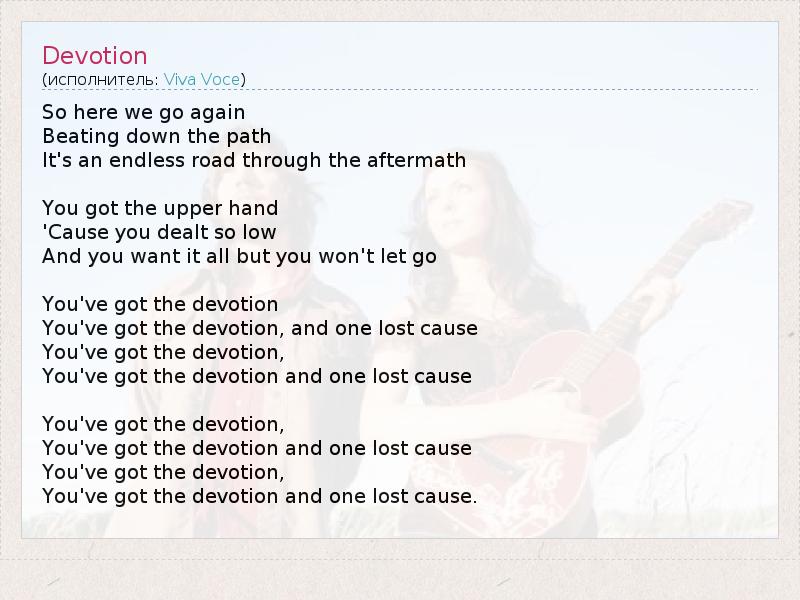 So here we go again Beating down the path It's an endless road through the aftermath You got the upper hand 'Cause you dealt so low And you want it all but you won't let go You've got the devotion You've got the devotion, and one lost cause You've got the devotion, You've got the devotion and one lost cause You've got the devotion, You've got the devotion and one lost cause You've got the devotion, You've got the devotion and one lost cause.