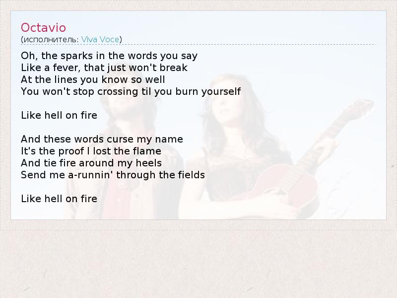 Oh, the sparks in the words you say Like a fever, that just won't break At the lines you know so well You won't stop crossing til you burn yourself Like hell on fire And these words curse my name It's the proof I lost the flame And tie fire around my heels Send me a-runnin' through the fields Like hell on fire