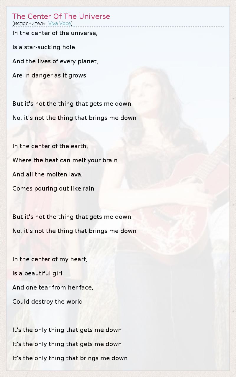 In the center of the universe, Is a star-sucking hole And the lives of every planet, Are in danger as it grows But it's not the thing that gets me down No, it's not the thing that brings me down In the center of the earth, Where the heat can melt your brain And all the molten lava, Comes pouring out like rain But it's not the thing that gets me down No, it's not the thing that brings me down In the center of my heart, Is a beautiful girl And one tear from her face, Could destroy the world It's the only thing that gets me down It's the only thing that gets me down It's the only thing that brings me down