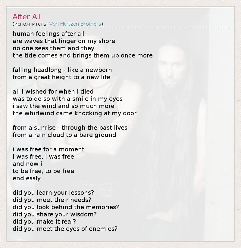 human feelings after all are waves that linger on my shore no one sees them and they the tide comes and brings them up once more falling headlong - like a newborn from a great height to a new life all i wished for when i died was to do so with a smile in my eyes i saw the wind and so much more the whirlwind came knocking at my door from a sunrise - through the past lives from a rain cloud to a bare ground i was free for a moment i was free, i was free and now i to be free, to be free endlessly did you learn your lessons? did you meet their needs? did you look behind the memories? did you share your wisdom? did you make it real? did you meet the eyes of enemies?