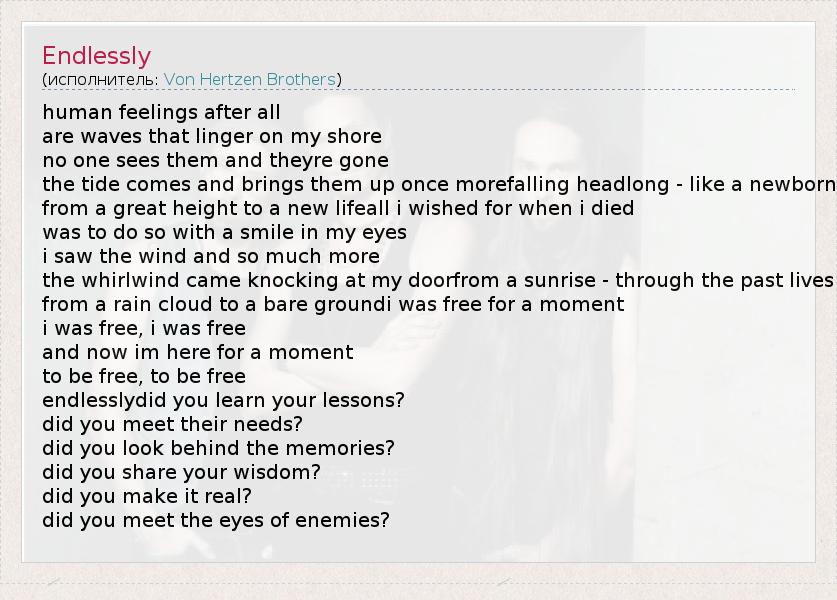 human feelings after all are waves that linger on my shore no one sees them and theyre gone the tide comes and brings them up once morefalling headlong - like a newborn from a great height to a new lifeall i wished for when i died was to do so with a smile in my eyes i saw the wind and so much more the whirlwind came knocking at my doorfrom a sunrise - through the past lives from a rain cloud to a bare groundi was free for a moment i was free, i was free and now im here for a moment to be free, to be free endlesslydid you learn your lessons? did you meet their needs? did you look behind the memories? did you share your wisdom? did you make it real? did you meet the eyes of enemies?