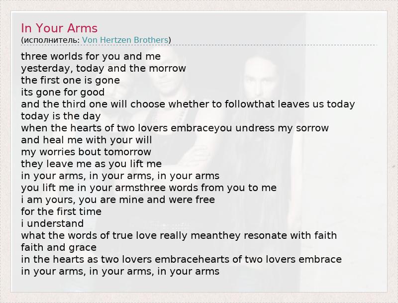 three worlds for you and me yesterday, today and the morrow the first one is gone its gone for good and the third one will choose whether to followthat leaves us today today is the day when the hearts of two lovers embraceyou undress my sorrow and heal me with your will my worries bout tomorrow they leave me as you lift me in your arms, in your arms, in your arms you lift me in your armsthree words from you to me i am yours, you are mine and were free for the first time i understand what the words of true love really meanthey resonate with faith faith and grace in the hearts as two lovers embracehearts of two lovers embrace in your arms, in your arms, in your arms