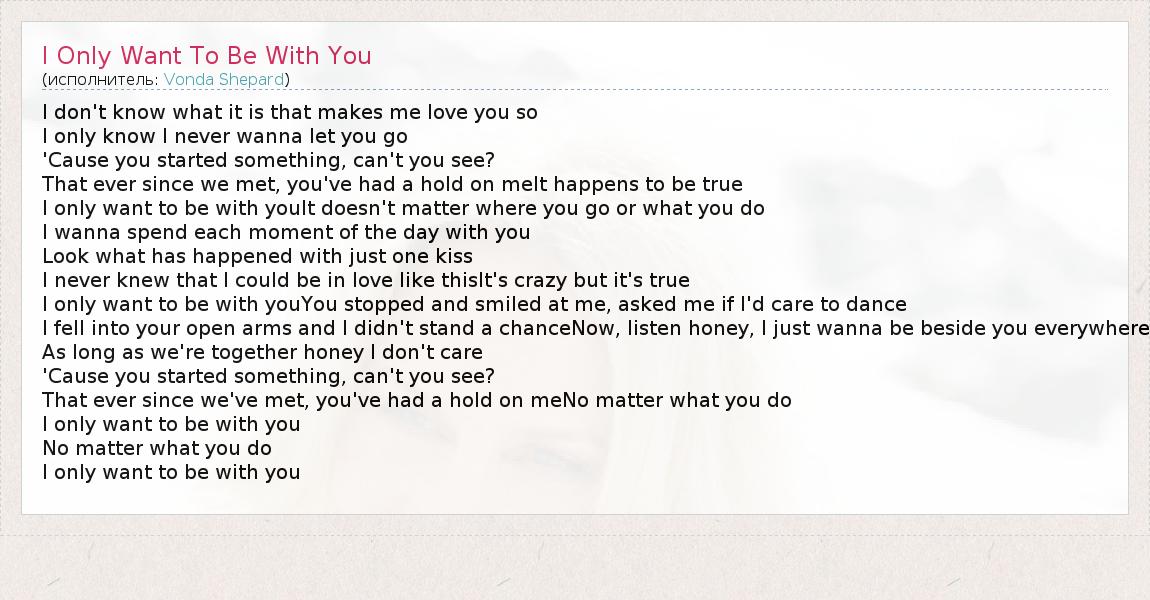 I don't know what it is that makes me love you so I only know I never wanna let you go 'Cause you started something, can't you see? That ever since we met, you've had a hold on meIt happens to be true I only want to be with youIt doesn't matter where you go or what you do I wanna spend each moment of the day with you Look what has happened with just one kiss I never knew that I could be in love like thisIt's crazy but it's true I only want to be with youYou stopped and smiled at me, asked me if I'd care to dance I fell into your open arms and I didn't stand a chanceNow, listen honey, I just wanna be beside you everywhere As long as we're together honey I don't care 'Cause you started something, can't you see? That ever since we've met, you've had a hold on meNo matter what you do I only want to be with you No matter what you do I only want to be with you
