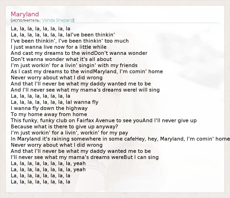 La, la, la, la, la, la, la, la La, la, la, la, la, la, la, laI've been thinkin' I've been thinkin', I've been thinkin' too much I just wanna live now for a little while And cast my dreams to the windDon't wanna wonder Don't wanna wonder what it's all about I'm just workin' for a livin' singin' with my friends As I cast my dreams to the windMaryland, I'm comin' home Never worry about what I did wrong And that I'll never be what my daddy wanted me to be And I'll never see what my mama's dreams wereI will sing La, la, la, la, la, la, la, la La, la, la, la, la, la, la, laI wanna fly I wanna fly down the highway To my home away from home This funky, funky club on Fairfax Avenue to see youAnd I'll never give up Because what is there to give up anyway? I'm just workin' for a livin', workin' for my pay In Maryland it's raining somewhere in some cafeHey, hey, Maryland, I'm comin' home Never worry about what I did wrong And that I'll never be what my daddy wanted me to be I'll never see what my mama's dreams wereBut I can sing La, la, la, la, la, la, la, la, yeah La, la, la, la, la, la, la, la, yeah La, la, la, la, la, la, la, la La, la, la, la, la, la, la, la