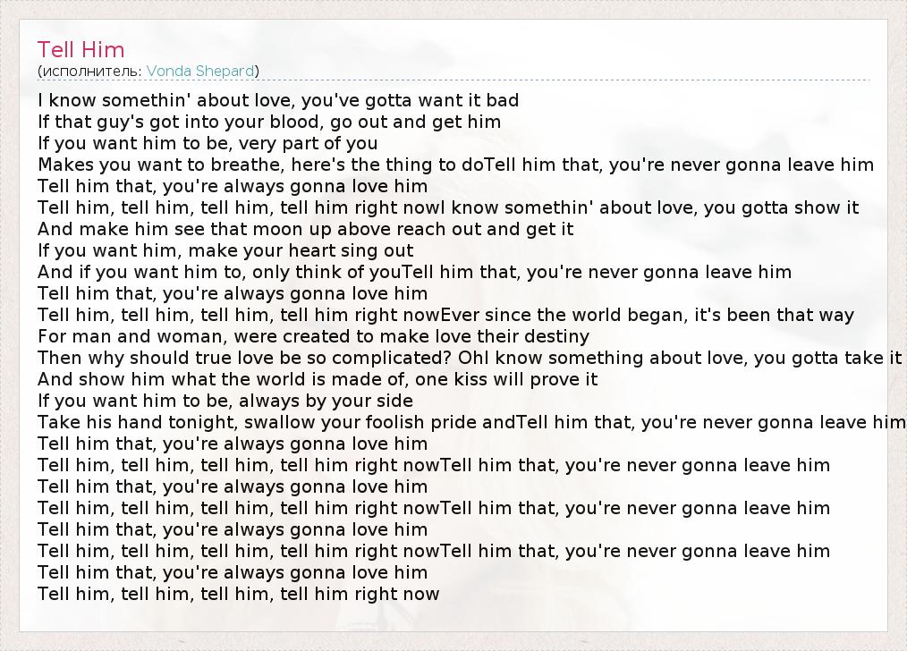 I know somethin' about love, you've gotta want it bad If that guy's got into your blood, go out and get him If you want him to be, very part of you Makes you want to breathe, here's the thing to doTell him that, you're never gonna leave him Tell him that, you're always gonna love him Tell him, tell him, tell him, tell him right nowI know somethin' about love, you gotta show it And make him see that moon up above reach out and get it If you want him, make your heart sing out And if you want him to, only think of youTell him that, you're never gonna leave him Tell him that, you're always gonna love him Tell him, tell him, tell him, tell him right nowEver since the world began, it's been that way For man and woman, were created to make love their destiny Then why should true love be so complicated? OhI know something about love, you gotta take it And show him what the world is made of, one kiss will prove it If you want him to be, always by your side Take his hand tonight, swallow your foolish pride andTell him that, you're never gonna leave him Tell him that, you're always gonna love him Tell him, tell him, tell him, tell him right nowTell him that, you're never gonna leave him Tell him that, you're always gonna love him Tell him, tell him, tell him, tell him right nowTell him that, you're never gonna leave him Tell him that, you're always gonna love him Tell him, tell him, tell him, tell him right nowTell him that, you're never gonna leave him Tell him that, you're always gonna love him Tell him, tell him, tell him, tell him right now