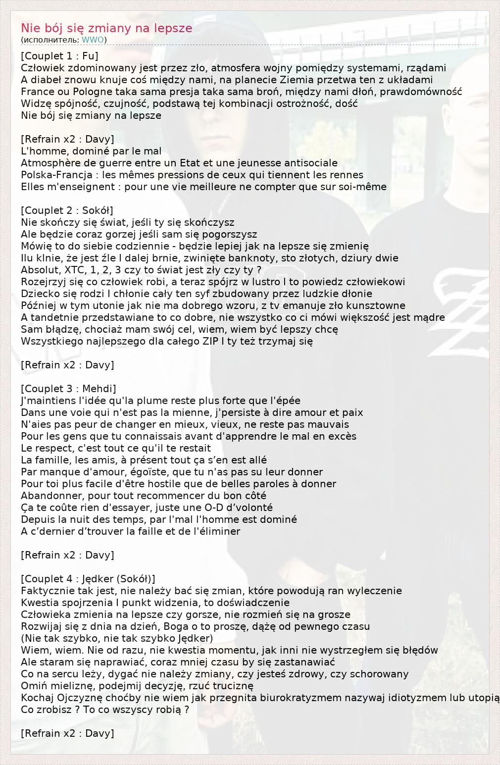 [Couplet 1 : Fu] Człowiek zdominowany jest przez zło, atmosfera wojny pomiędzy systemami, rządami A diabeł znowu knuje coś między nami, na planecie Ziemia przetwa ten z układami France ou Pologne taka sama presja taka sama broń, między nami dłoń, prawdomówność Widzę spójność, czujność, podstawą tej kombinacji ostrożność, dość Nie bój się zmiany na lepsze [Refrain x2 : Davy] L'homme, dominé par le mal Atmosphère de guerre entre un Etat et une jeunesse antisociale Polska-Francja : les mêmes pressions de ceux qui tiennent les rennes Elles m'enseignent : pour une vie meilleure ne compter que sur soi-même [Couplet 2 : Sokół] Nie skończy się świat, jeśli ty się skończysz Ale będzie coraz gorzej jeśli sam się pogorszysz Mówię to do siebie codziennie - będzie lepiej jak na lepsze się zmienię Ilu klnie, że jest źle I dalej brnie, zwinięte banknoty, sto złotych, dziury dwie Absolut, XTC, 1, 2, 3 czy to świat jest zły czy ty ? Rozejrzyj się co człowiek robi, a teraz spójrz w lustro I to powiedz człowiekowi Dziecko się rodzi I chłonie cały ten syf zbudowany przez ludzkie dłonie Później w tym utonie jak nie ma dobrego wzoru, z tv emanuje zło kunsztowne A tandetnie przedstawiane to co dobre, nie wszystko co ci mówi większość jest mądre Sam błądzę, chociaż mam swój cel, wiem, wiem być lepszy chcę Wszystkiego najlepszego dla całego ZIP I ty też trzymaj się [Refrain x2 : Davy] [Couplet 3 : Mehdi] J'maintiens l'idée qu'la plume reste plus forte que l'épée Dans une voie qui n'est pas la mienne, j'persiste à dire amour et paix N'aies pas peur de changer en mieux, vieux, ne reste pas mauvais Pour les gens que tu connaissais avant d'apprendre le mal en excès Le respect, c'est tout ce qu'il te restait La famille, les amis, à présent tout ça s’en est allé Par manque d'amour, égoïste, que tu n'as pas su leur donner Pour toi plus facile d'être hostile que de belles paroles à donner Abandonner, pour tout recommencer du bon côté Ça te coûte rien d'essayer, juste une O-D d’volonté Depuis la nuit des temps, par l'mal l'homme est dominé A c’dernier d’trouver la faille et de l'éliminer [Refrain x2 : Davy] [Couplet 4 : Jędker (Sokół)] Faktycznie tak jest, nie należy bać się zmian, które powodują ran wyleczenie Kwestia spojrzenia I punkt widzenia, to doświadczenie Człowieka zmienia na lepsze czy gorsze, nie rozmień się na grosze Rozwijaj się z dnia na dzień, Boga o to proszę, dążę od pewnego czasu (Nie tak szybko, nie tak szybko Jędker) Wiem, wiem. Nie od razu, nie kwestia momentu, jak inni nie wystrzegłem się błędów Ale staram się naprawiać, coraz mniej czasu by się zastanawiać Co na sercu leży, dygać nie należy zmiany, czy jesteś zdrowy, czy schorowany Omiń mieliznę, podejmij decyzję, rzuć truciznę Kochaj Ojczyznę choćby nie wiem jak przegnita biurokratyzmem nazywaj idiotyzmem lub utopią Co zrobisz ? To co wszyscy robią ? [Refrain x2 : Davy]
