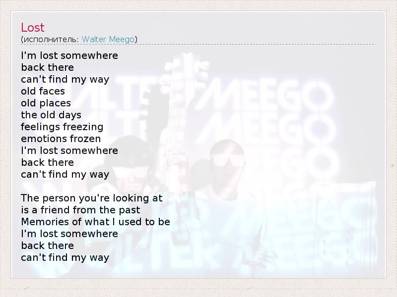 I'm lost somewhere back there can't find my way old faces old places the old days feelings freezing emotions frozen I'm lost somewhere back there can't find my way The person you're looking at is a friend from the past Memories of what I used to be I'm lost somewhere back there can't find my way
