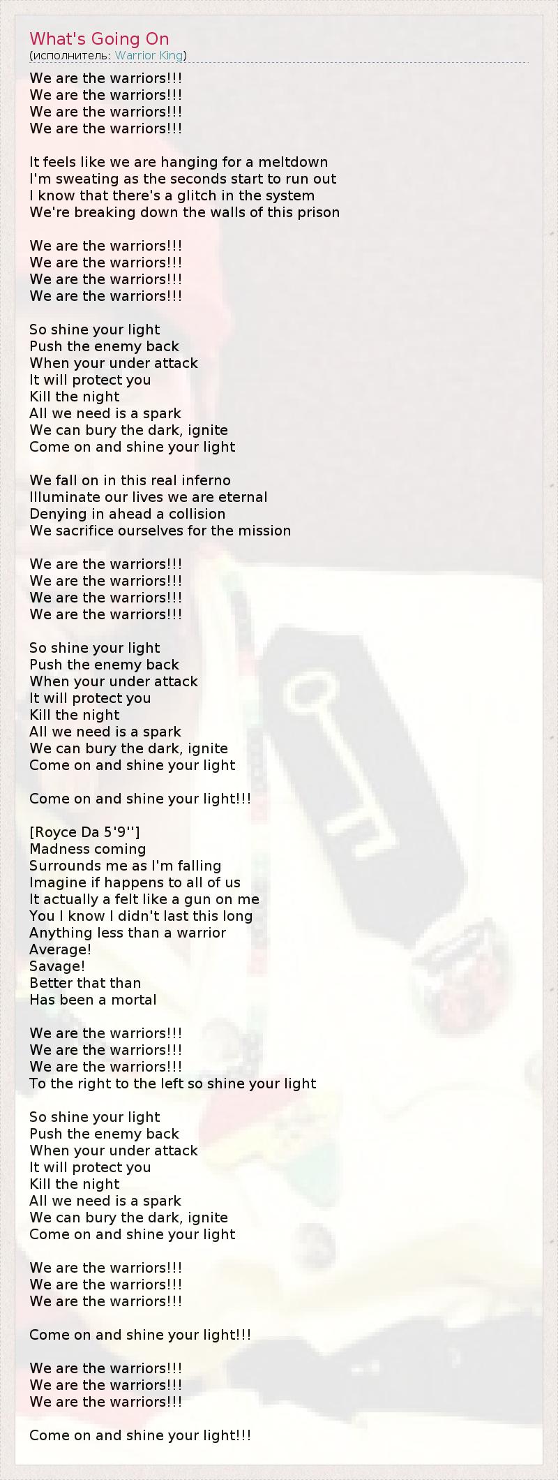 We are the warriors!!! We are the warriors!!! We are the warriors!!! We are the warriors!!! It feels like we are hanging for a meltdown I'm sweating as the seconds start to run out I know that there's a glitch in the system We're breaking down the walls of this prison We are the warriors!!! We are the warriors!!! We are the warriors!!! We are the warriors!!! So shine your light Push the enemy back When your under attack It will protect you Kill the night All we need is a spark We can bury the dark, ignite Come on and shine your light We fall on in this real inferno Illuminate our lives we are eternal Denying in ahead a collision We sacrifice ourselves for the mission We are the warriors!!! We are the warriors!!! We are the warriors!!! We are the warriors!!! So shine your light Push the enemy back When your under attack It will protect you Kill the night All we need is a spark We can bury the dark, ignite Come on and shine your light Come on and shine your light!!! [Royce Da 5'9''] Madness coming Surrounds me as I'm falling Imagine if happens to all of us It actually a felt like a gun on me You I know I didn't last this long Anything less than a warrior Average! Savage! Better that than Has been a mortal We are the warriors!!! We are the warriors!!! We are the warriors!!! To the right to the left so shine your light So shine your light Push the enemy back When your under attack It will protect you Kill the night All we need is a spark We can bury the dark, ignite Come on and shine your light We are the warriors!!! We are the warriors!!! We are the warriors!!! Come on and shine your light!!! We are the warriors!!! We are the warriors!!! We are the warriors!!! Come on and shine your light!!!