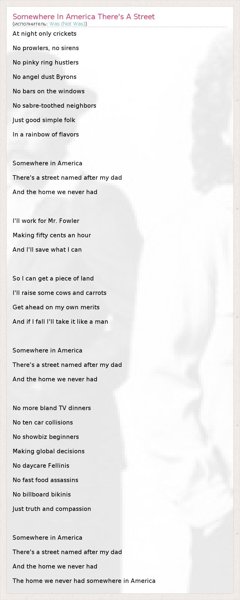 At night only crickets No prowlers, no sirens No pinky ring hustlers No angel dust Byrons No bars on the windows No sabre-toothed neighbors Just good simple folk In a rainbow of flavors Somewhere in America There's a street named after my dad And the home we never had I'll work for Mr. Fowler Making fifty cents an hour And I'll save what I can So I can get a piece of land I'll raise some cows and carrots Get ahead on my own merits And if I fall I'll take it like a man Somewhere in America There's a street named after my dad And the home we never had No more bland TV dinners No ten car collisions No showbiz beginners Making global decisions No daycare Fellinis No fast food assassins No billboard bikinis Just truth and compassion Somewhere in America There's a street named after my dad And the home we never had The home we never had somewhere in America