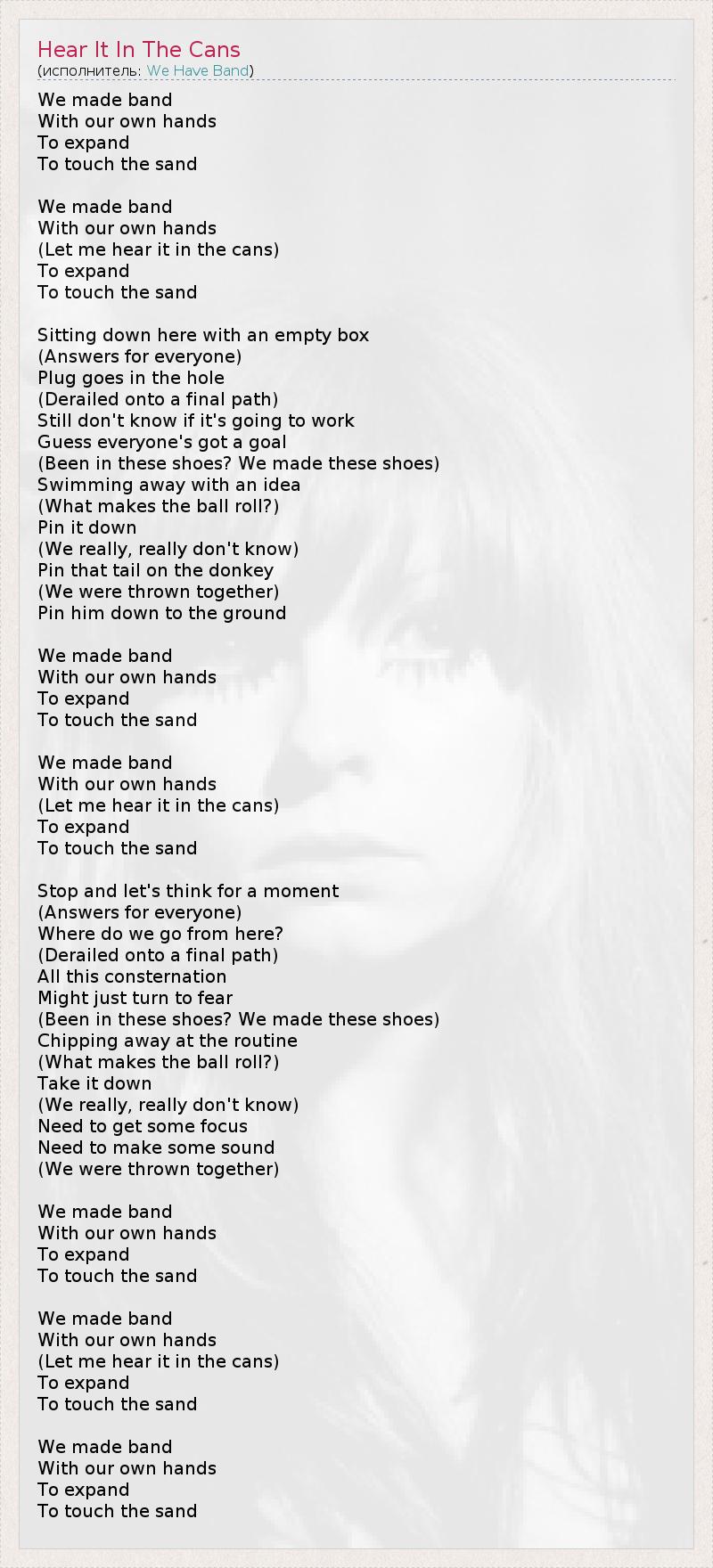 We made band With our own hands To expand To touch the sand We made band With our own hands (Let me hear it in the cans) To expand To touch the sand Sitting down here with an empty box (Answers for everyone) Plug goes in the hole (Derailed onto a final path) Still don't know if it's going to work Guess everyone's got a goal (Been in these shoes? We made these shoes) Swimming away with an idea (What makes the ball roll?) Pin it down (We really, really don't know) Pin that tail on the donkey (We were thrown together) Pin him down to the ground We made band With our own hands To expand To touch the sand We made band With our own hands (Let me hear it in the cans) To expand To touch the sand Stop and let's think for a moment (Answers for everyone) Where do we go from here? (Derailed onto a final path) All this consternation Might just turn to fear (Been in these shoes? We made these shoes) Chipping away at the routine (What makes the ball roll?) Take it down (We really, really don't know) Need to get some focus Need to make some sound (We were thrown together) We made band With our own hands To expand To touch the sand We made band With our own hands (Let me hear it in the cans) To expand To touch the sand We made band With our own hands To expand To touch the sand