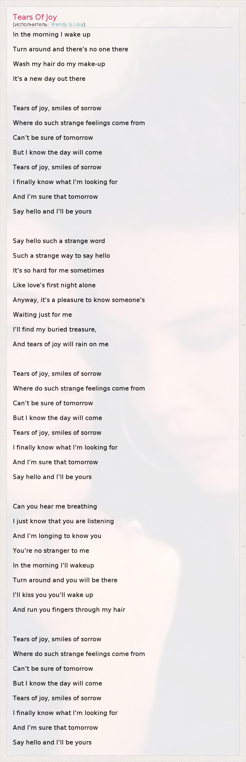 In the morning I wake up Turn around and there's no one there Wash my hair do my make-up It's a new day out there Tears of joy, smiles of sorrow Where do such strange feelings come from Can't be sure of tomorrow But I know the day will come Tears of joy, smiles of sorrow I finally know what I'm looking for And I'm sure that tomorrow Say hello and I'll be yours Say hello such a strange word Such a strange way to say hello It's so hard for me sometimes Like love's first night alone Anyway, it's a pleasure to know someone's Waiting just for me I'll find my buried treasure, And tears of joy will rain on me Tears of joy, smiles of sorrow Where do such strange feelings come from Can't be sure of tomorrow But I know the day will come Tears of joy, smiles of sorrow I finally know what I'm looking for And I'm sure that tomorrow Say hello and I'll be yours Can you hear me breathing I just know that you are listening And I'm longing to know you You're no stranger to me In the morning I'll wakeup Turn around and you will be there I'll kiss you you'll wake up And run you fingers through my hair Tears of joy, smiles of sorrow Where do such strange feelings come from Can't be sure of tomorrow But I know the day will come Tears of joy, smiles of sorrow I finally know what I'm looking for And I'm sure that tomorrow Say hello and I'll be yours