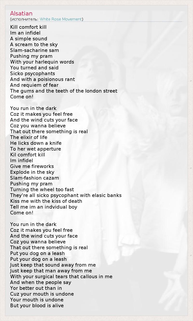 Kill comfort kill Im an infidel A simple sound A scream to the sky Slam-sacharine sam Pushing my pram With your harlequin words You turned and said Sicko psycophants And with a poisionous rant And requiem of fear The gums and the teeth of the london street Come on! You run in the dark Coz it makes you feel free And the wind cuts your face Coz you wanna believe That out there something is real The elixir of life He licks down a knife To her wet apperture Kil comfort kill Im infidel Give me fireworks Explode in the sky Slam-fashion cazam Pushing my pram Turning the wheel too fast They're all sicko psycophant with elasic banks Kiss me with the kiss of death Tell me im an indvidual boy Come on! You run in the dark Coz it makes you feel free And the wind cuts your face Coz you wanna believe That out there something is real Put you dog on a leash Put your dog on a leash Just keep that sound away from me Just keep that man away from me With your surgical tears that callous in me And when the people say Yor better out than in Cuz your mouth is undone Your mouth is undone But your blood is alive