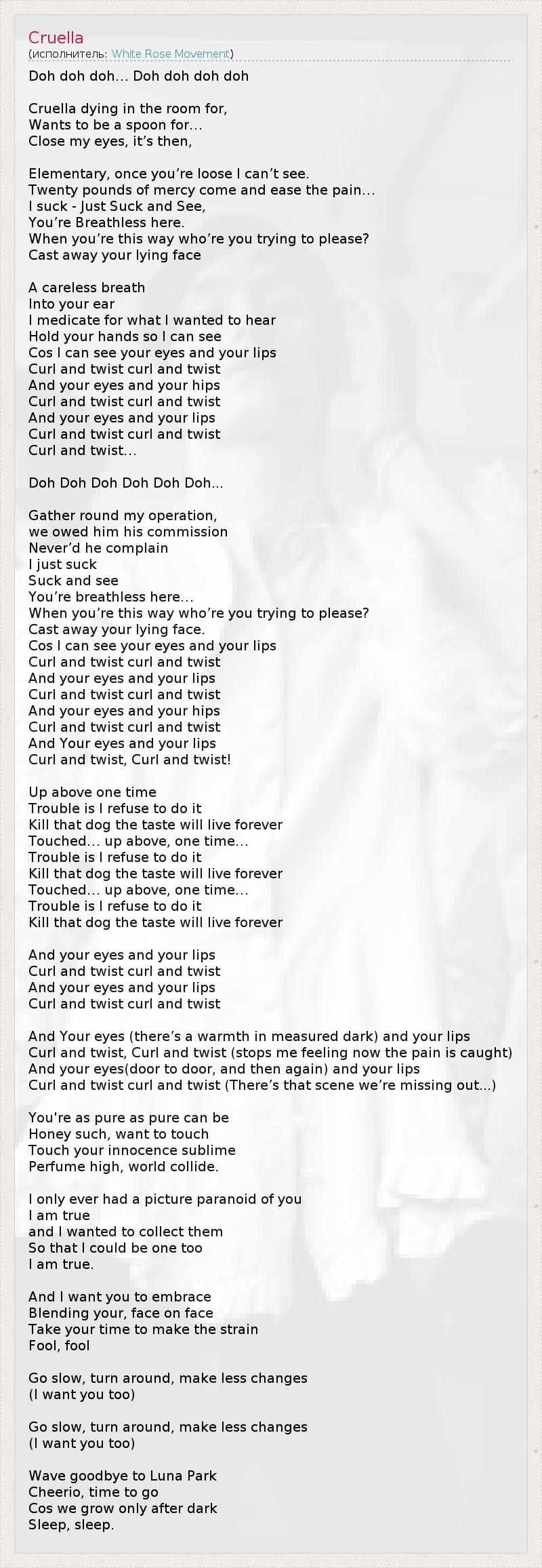 Doh doh doh… Doh doh doh doh Cruella dying in the room for, Wants to be a spoon for… Close my eyes, it’s then, Elementary, once you’re loose I can’t see. Twenty pounds of mercy come and ease the pain… I suck - Just Suck and See, You’re Breathless here. When you’re this way who’re you trying to please? Cast away your lying face A careless breath Into your ear I medicate for what I wanted to hear Hold your hands so I can see Cos I can see your eyes and your lips Curl and twist curl and twist And your eyes and your hips Curl and twist curl and twist And your eyes and your lips Curl and twist curl and twist Curl and twist… Doh Doh Doh Doh Doh Doh... Gather round my operation, we owed him his commission Never’d he complain I just suck Suck and see You’re breathless here… When you’re this way who’re you trying to please? Cast away your lying face. Cos I can see your eyes and your lips Curl and twist curl and twist And your eyes and your lips Curl and twist curl and twist And your eyes and your hips Curl and twist curl and twist And Your eyes and your lips Curl and twist, Curl and twist! Up above one time Trouble is I refuse to do it Kill that dog the taste will live forever Touched… up above, one time… Trouble is I refuse to do it Kill that dog the taste will live forever Touched… up above, one time… Trouble is I refuse to do it Kill that dog the taste will live forever And your eyes and your lips Curl and twist curl and twist And your eyes and your lips Curl and twist curl and twist And Your eyes (there’s a warmth in measured dark) and your lips Curl and twist, Curl and twist (stops me feeling now the pain is caught) And your eyes(door to door, and then again) and your lips Curl and twist curl and twist (There’s that scene we’re missing out...) You're as pure as pure can be Honey such, want to touch Touch your innocence sublime Perfume high, world collide. I only ever had a picture paranoid of you I am true and I wanted to collect them So that I could be one too I am true. And I want you to embrace Blending your, face on face Take your time to make the strain Fool, fool Go slow, turn around, make less changes (I want you too) Go slow, turn around, make less changes (I want you too) Wave goodbye to Luna Park Cheerio, time to go Cos we grow only after dark Sleep, sleep.