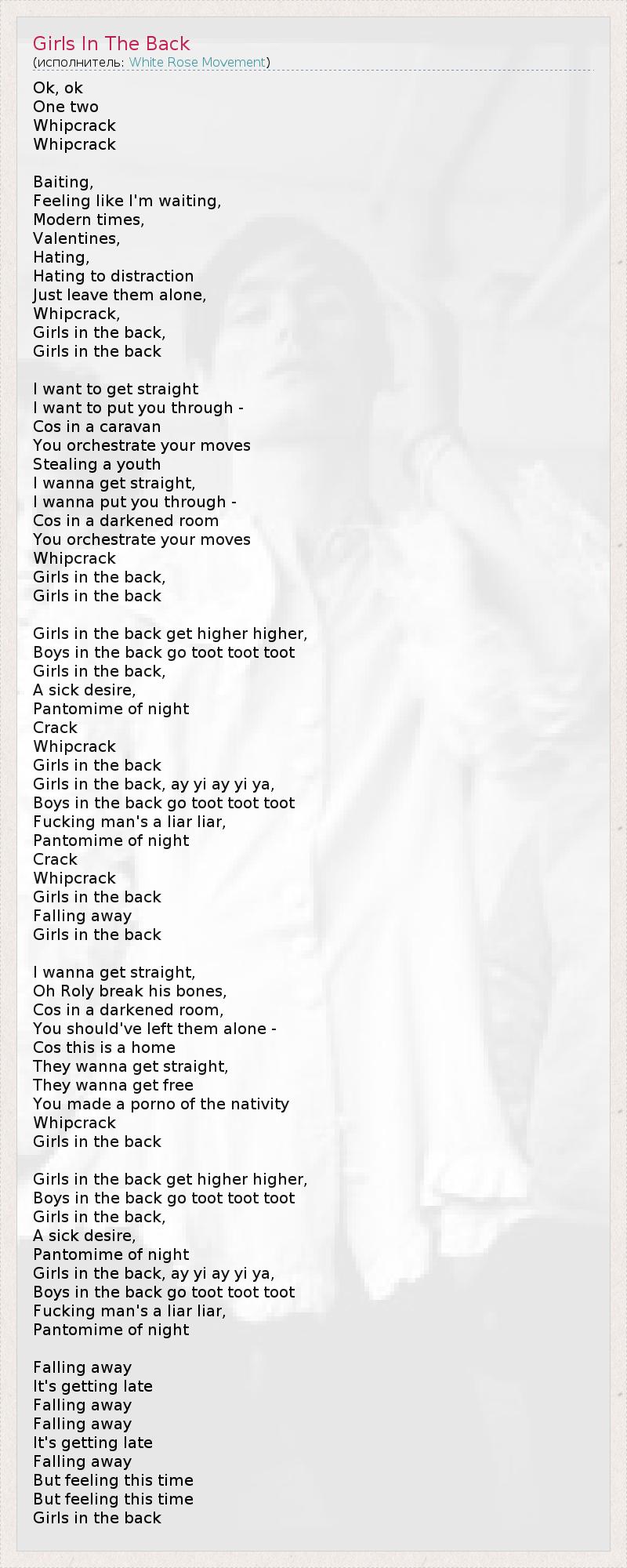 Ok, ok One two Whipcrack Whipcrack Baiting, Feeling like I'm waiting, Modern times, Valentines, Hating, Hating to distraction Just leave them alone, Whipcrack, Girls in the back, Girls in the back I want to get straight I want to put you through - Cos in a caravan You orchestrate your moves Stealing a youth I wanna get straight, I wanna put you through - Cos in a darkened room You orchestrate your moves Whipcrack Girls in the back, Girls in the back Girls in the back get higher higher, Boys in the back go toot toot toot Girls in the back, A sick desire, Pantomime of night Crack Whipcrack Girls in the back Girls in the back, ay yi ay yi ya, Boys in the back go toot toot toot Fucking man's a liar liar, Pantomime of night Crack Whipcrack Girls in the back Falling away Girls in the back I wanna get straight, Oh Roly break his bones, Cos in a darkened room, You should've left them alone - Cos this is a home They wanna get straight, They wanna get free You made a porno of the nativity Whipcrack Girls in the back Girls in the back get higher higher, Boys in the back go toot toot toot Girls in the back, A sick desire, Pantomime of night Girls in the back, ay yi ay yi ya, Boys in the back go toot toot toot Fucking man's a liar liar, Pantomime of night Falling away It's getting late Falling away Falling away It's getting late Falling away But feeling this time But feeling this time Girls in the back