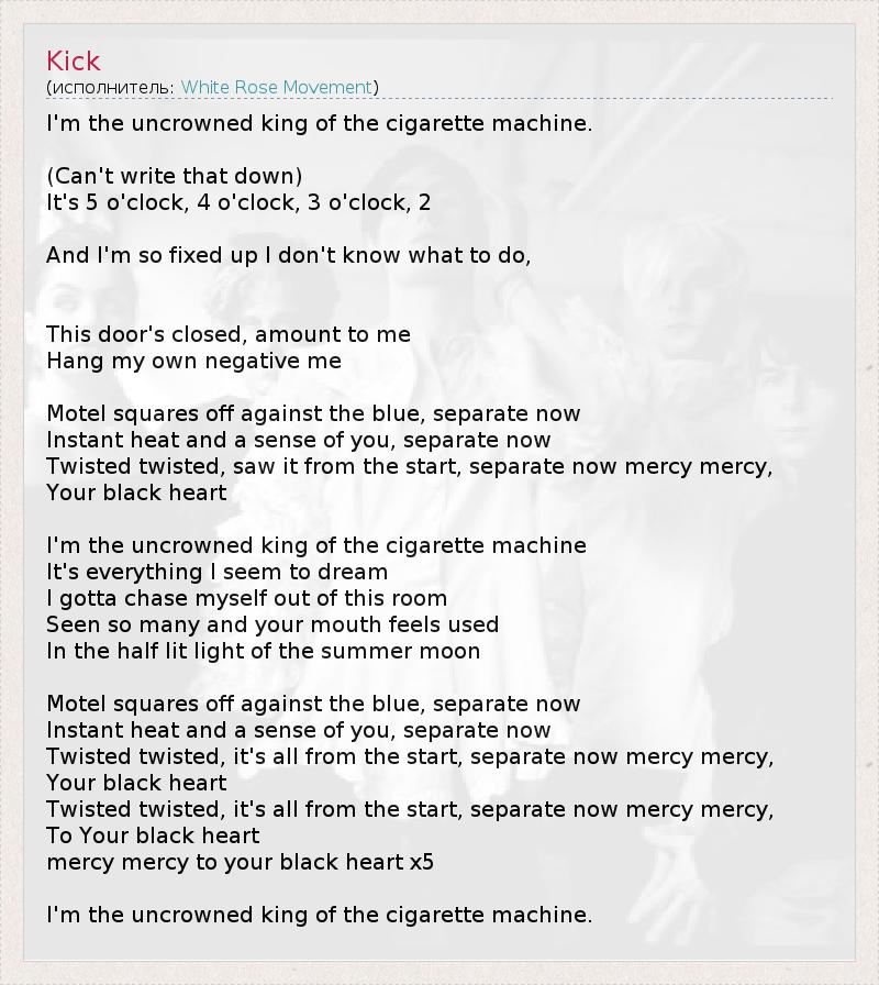 I'm the uncrowned king of the cigarette machine. (Can't write that down) It's 5 o'clock, 4 o'clock, 3 o'clock, 2 And I'm so fixed up I don't know what to do, This door's closed, amount to me Hang my own negative me Motel squares off against the blue, separate now Instant heat and a sense of you, separate now Twisted twisted, saw it from the start, separate now mercy mercy, Your black heart I'm the uncrowned king of the cigarette machine It's everything I seem to dream I gotta chase myself out of this room Seen so many and your mouth feels used In the half lit light of the summer moon Motel squares off against the blue, separate now Instant heat and a sense of you, separate now Twisted twisted, it's all from the start, separate now mercy mercy, Your black heart Twisted twisted, it's all from the start, separate now mercy mercy, To Your black heart mercy mercy to your black heart x5 I'm the uncrowned king of the cigarette machine.