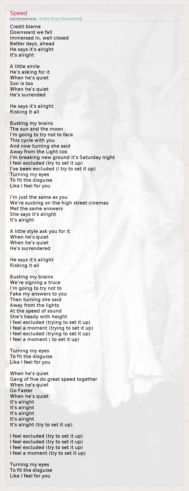 Credit blame Downward we fall Immersed in, well closed Better days, ahead He says it's alright It's alright A little smile He's asking for it When he's quiet Son is too When he's quiet He's surrended He says it's alright Risking It all Busting my brains The sun and the moon I'm going to try not to face This cycle with you And now turning she said Away from the Light cos I'm breaking new ground it's Saturday night I feel excluded (try to set it up) I've been excluded (I try to set it up) Turning my eyes To fit the disguise Like I feel for you I'm just the same as you We're sucking on the high street cinemas Met the same answers She says it's alright It's alright A little style ask you for it When he's quiet When he's quiet He's surrendered He says it's alright Risking it all Busting my brains We're signing a truce I'm going to try not to Fake my answers to you Then turning she said Away from the lights At the speed of sound She's heady with height I feel excluded (trying to set it up) I feel a moment (trying to set it up) I feel excluded (trying to set it up) I feel a moment ( to set it up) Turning my eyes To fit the disguise Like I feel for you When he's quiet Gang of five do great speed together When he's quiet Go Faster When he's quiet It's alright It's alright It's alright It's alright It's alright (try to set it up) I feel excluded (try to set it up) I feel excluded (try to set it up) I feel excluded (try to set it up) I feel a moment (try to set it up) Turning my eyes To fit the disguise Like I feel for you