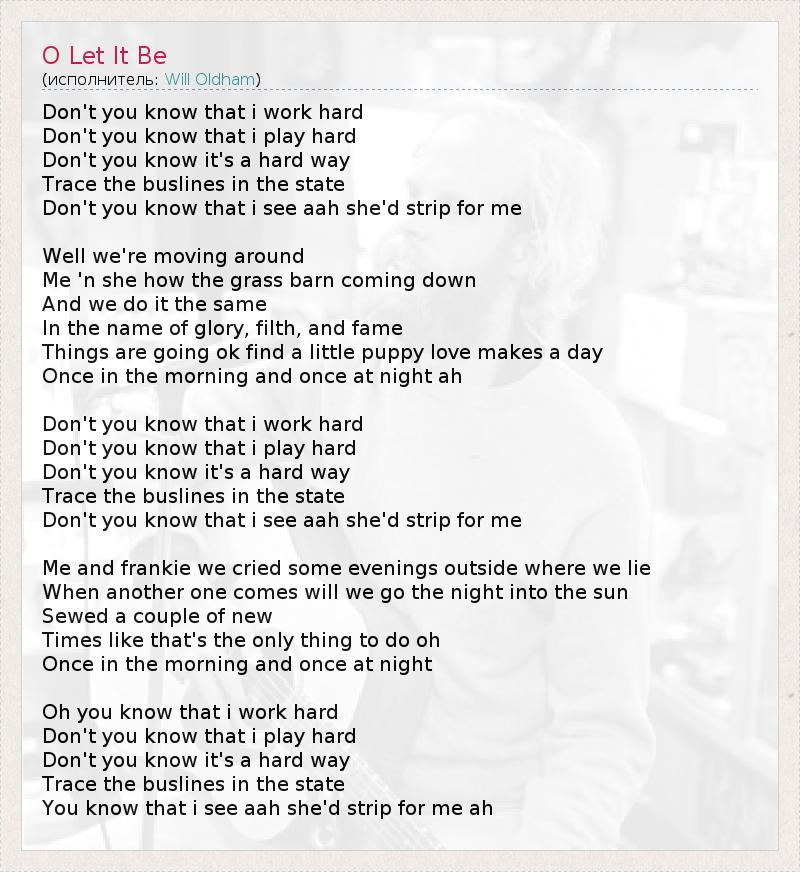 Don't you know that i work hard Don't you know that i play hard Don't you know it's a hard way Trace the buslines in the state Don't you know that i see aah she'd strip for me Well we're moving around Me 'n she how the grass barn coming down And we do it the same In the name of glory, filth, and fame Things are going ok find a little puppy love makes a day Once in the morning and once at night ah Don't you know that i work hard Don't you know that i play hard Don't you know it's a hard way Trace the buslines in the state Don't you know that i see aah she'd strip for me Me and frankie we cried some evenings outside where we lie When another one comes will we go the night into the sun Sewed a couple of new Times like that's the only thing to do oh Once in the morning and once at night Oh you know that i work hard Don't you know that i play hard Don't you know it's a hard way Trace the buslines in the state You know that i see aah she'd strip for me ah