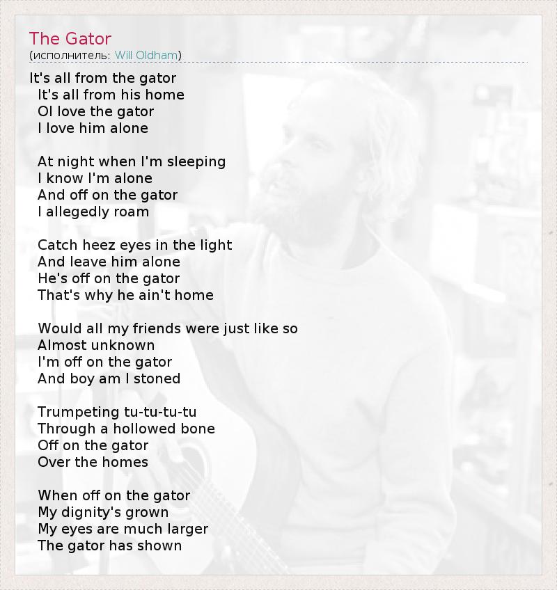 It's all from the gator It's all from his home OI love the gator I love him alone At night when I'm sleeping I know I'm alone And off on the gator I allegedly roam Catch heez eyes in the light And leave him alone He's off on the gator That's why he ain't home Would all my friends were just like so Almost unknown I'm off on the gator And boy am I stoned Trumpeting tu-tu-tu-tu Through a hollowed bone Off on the gator Over the homes When off on the gator My dignity's grown My eyes are much larger The gator has shown