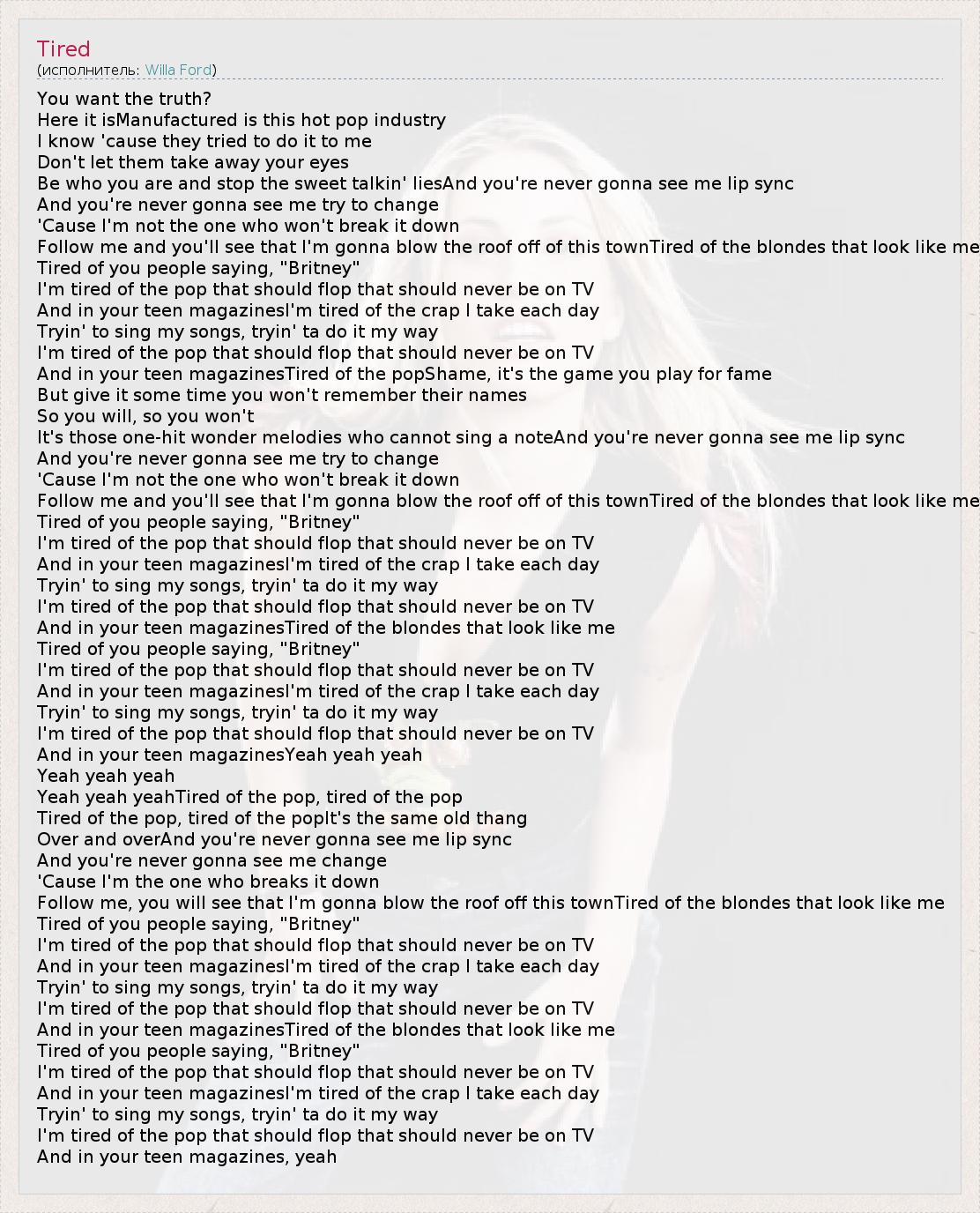 You want the truth? Here it isManufactured is this hot pop industry I know 'cause they tried to do it to me Don't let them take away your eyes Be who you are and stop the sweet talkin' liesAnd you're never gonna see me lip sync And you're never gonna see me try to change 'Cause I'm not the one who won't break it down Follow me and you'll see that I'm gonna blow the roof off of this townTired of the blondes that look like me Tired of you people saying, "Britney" I'm tired of the pop that should flop that should never be on TV And in your teen magazinesI'm tired of the crap I take each day Tryin' to sing my songs, tryin' ta do it my way I'm tired of the pop that should flop that should never be on TV And in your teen magazinesTired of the popShame, it's the game you play for fame But give it some time you won't remember their names So you will, so you won't It's those one-hit wonder melodies who cannot sing a noteAnd you're never gonna see me lip sync And you're never gonna see me try to change 'Cause I'm not the one who won't break it down Follow me and you'll see that I'm gonna blow the roof off of this townTired of the blondes that look like me Tired of you people saying, "Britney" I'm tired of the pop that should flop that should never be on TV And in your teen magazinesI'm tired of the crap I take each day Tryin' to sing my songs, tryin' ta do it my way I'm tired of the pop that should flop that should never be on TV And in your teen magazinesTired of the blondes that look like me Tired of you people saying, "Britney" I'm tired of the pop that should flop that should never be on TV And in your teen magazinesI'm tired of the crap I take each day Tryin' to sing my songs, tryin' ta do it my way I'm tired of the pop that should flop that should never be on TV And in your teen magazinesYeah yeah yeah Yeah yeah yeah Yeah yeah yeahTired of the pop, tired of the pop Tired of the pop, tired of the popIt's the same old thang Over and overAnd you're never gonna see me lip sync And you're never gonna see me change 'Cause I'm the one who breaks it down Follow me, you will see that I'm gonna blow the roof off this townTired of the blondes that look like me Tired of you people saying, "Britney" I'm tired of the pop that should flop that should never be on TV And in your teen magazinesI'm tired of the crap I take each day Tryin' to sing my songs, tryin' ta do it my way I'm tired of the pop that should flop that should never be on TV And in your teen magazinesTired of the blondes that look like me Tired of you people saying, "Britney" I'm tired of the pop that should flop that should never be on TV And in your teen magazinesI'm tired of the crap I take each day Tryin' to sing my songs, tryin' ta do it my way I'm tired of the pop that should flop that should never be on TV And in your teen magazines, yeah
