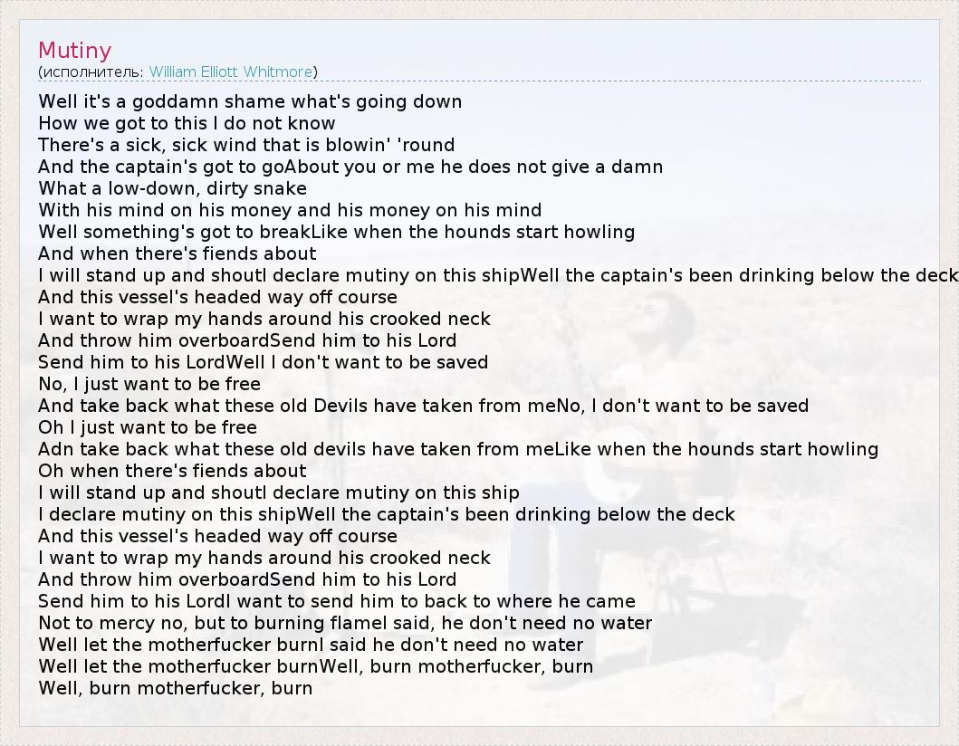 Well it's a goddamn shame what's going down How we got to this I do not know There's a sick, sick wind that is blowin' 'round And the captain's got to goAbout you or me he does not give a damn What a low-down, dirty snake With his mind on his money and his money on his mind Well something's got to breakLike when the hounds start howling And when there's fiends about I will stand up and shoutI declare mutiny on this shipWell the captain's been drinking below the deck And this vessel's headed way off course I want to wrap my hands around his crooked neck And throw him overboardSend him to his Lord Send him to his LordWell I don't want to be saved No, I just want to be free And take back what these old Devils have taken from meNo, I don't want to be saved Oh I just want to be free Adn take back what these old devils have taken from meLike when the hounds start howling Oh when there's fiends about I will stand up and shoutI declare mutiny on this ship I declare mutiny on this shipWell the captain's been drinking below the deck And this vessel's headed way off course I want to wrap my hands around his crooked neck And throw him overboardSend him to his Lord Send him to his LordI want to send him to back to where he came Not to mercy no, but to burning flameI said, he don't need no water Well let the motherfucker burnI said he don't need no water Well let the motherfucker burnWell, burn motherfucker, burn Well, burn motherfucker, burn