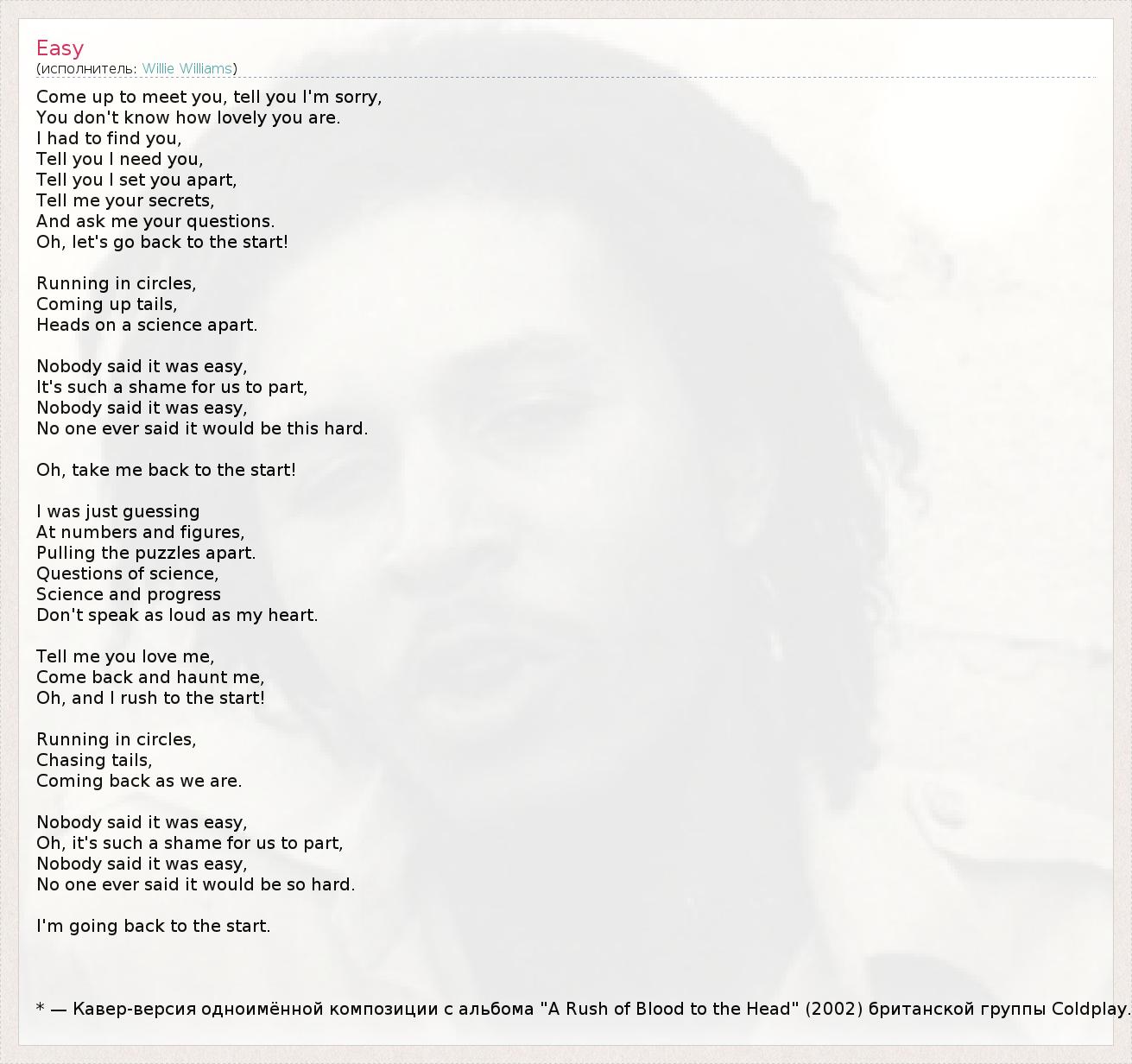 Come up to meet you, tell you I'm sorry, You don't know how lovely you are. I had to find you, Tell you I need you, Tell you I set you apart, Tell me your secrets, And ask me your questions. Oh, let's go back to the start! Running in circles, Coming up tails, Heads on a science apart. Nobody said it was easy, It's such a shame for us to part, Nobody said it was easy, No one ever said it would be this hard. Oh, take me back to the start! I was just guessing At numbers and figures, Pulling the puzzles apart. Questions of science, Science and progress Don't speak as loud as my heart. Tell me you love me, Come back and haunt me, Oh, and I rush to the start! Running in circles, Chasing tails, Coming back as we are. Nobody said it was easy, Oh, it's such a shame for us to part, Nobody said it was easy, No one ever said it would be so hard. I'm going back to the start. * — Кавер-версия одноимённой композиции с альбома "A Rush of Blood to the Head" (2002) британской группы Coldplay.