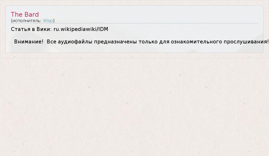 Статья в Вики: ru.wikipediawiki/IDM Внимание! Все аудиофайлы предназначены только для ознакомительного прослушивания!