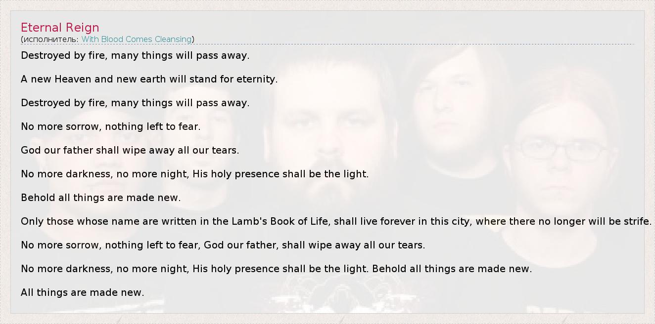 Это интересно:With Blood Comes Cleansing - христианская дэткор-команда из Джорджии. После самостоятельного выпуска в январе 2006 ЕР с шестью песнями, парни почти сразу начали сотрудничество с звукозаписывающей компанией Blood and Ink Records. Далее летом 2007 With Blood Comes Cleansing выпускают свой первый альбом под названием Golgotha. После этого команда отправляется в тур и завоевывает огромное количество фанатов по всей Америке. Вскоре... продолжение