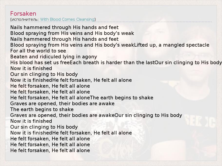 Это интересно:With Blood Comes Cleansing - христианская дэткор-команда из Джорджии. После самостоятельного выпуска в январе 2006 ЕР с шестью песнями, парни почти сразу начали сотрудничество с звукозаписывающей компанией Blood and Ink Records. Далее летом 2007 With Blood Comes Cleansing выпускают свой первый альбом под названием Golgotha. После этого команда отправляется в тур и завоевывает огромное количество фанатов по всей Америке. Вскоре... продолжение