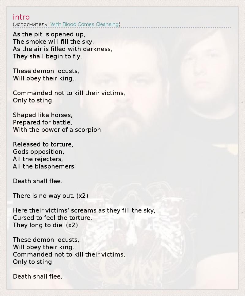 As the pit is opened up, The smoke will fill the sky. As the air is filled with darkness, They shall begin to fly. These demon locusts, Will obey their king. Commanded not to kill their victims, Only to sting. Shaped like horses, Prepared for battle, With the power of a scorpion. Released to torture, Gods opposition, All the rejecters, All the blasphemers. Death shall flee. There is no way out. (x2) Here their victims' screams as they fill the sky, Cursed to feel the torture, They long to die. (x2) These demon locusts, Will obey their king. Commanded not to kill their victims, Only to sting. Death shall flee.