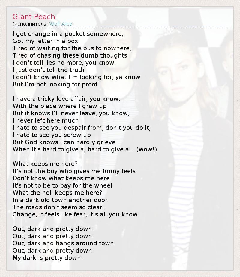 Где-то в кармане гремит мелочь, Письмо валяется в ящике, Я устала ждать автобус в никуда, Устала прогонять эти глупые мысли. Знаешь, я больше я не лгу, Но и не говорю правды. Знаешь, я сама не знаю, что ищу, Но я точно не ищу доказательств. Знаешь, у меня коварный роман С тем местом, где я выросла. Но оно знает, что я никуда не денусь, Я никогда не оставляла здесь слишком много. Я ненавижу смотреть, когда ты отчаиваешься, ведь ты так и делаешь? Ненавижу смотреть, когда ты поджимаешь губы. Но Бог видит, что у меня едва ли получается горевать, Когда сложно не быть, сложно не быть... 1 (уоу!) Что держит меня здесь? Точно не тот парень, который забавляет меня, Не знаю, что держит меня здесь. Но точно не то, что можно стать "приманкой" для колёс. Так что, чёрт возьми, держит меня здесь, В тёмном старом городке по соседству? Дороги не кажутся слишком чистыми, Но перемены, они схожи со страхом, и это всё, что ты знаешь. Там снаружи темно и довольно низко, Там снаружи темно и довольно низко, Там снаружи темно и склоны вокруг города, Там снаружи темно и довольно низко, Моя темнота довольно низко! 1 - возможное продолжение английской фразы - "It's hard to give a damn/f*ck". Аналогично в русском - "Сложно не быть равнодушной"