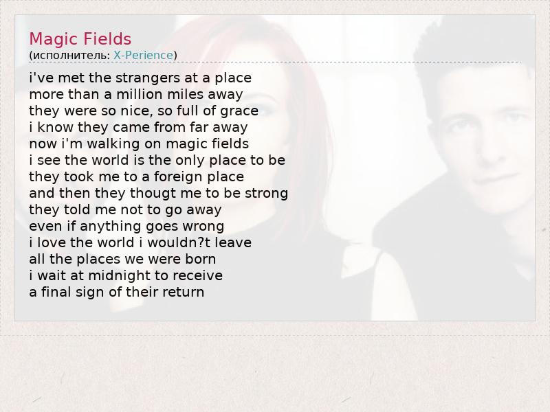 i've met the strangers at a place more than a million miles away they were so nice, so full of grace i know they came from far away now i'm walking on magic fields i see the world is the only place to be they took me to a foreign place and then they thougt me to be strong they told me not to go away even if anything goes wrong i love the world i wouldn?t leave all the places we were born i wait at midnight to receive a final sign of their return